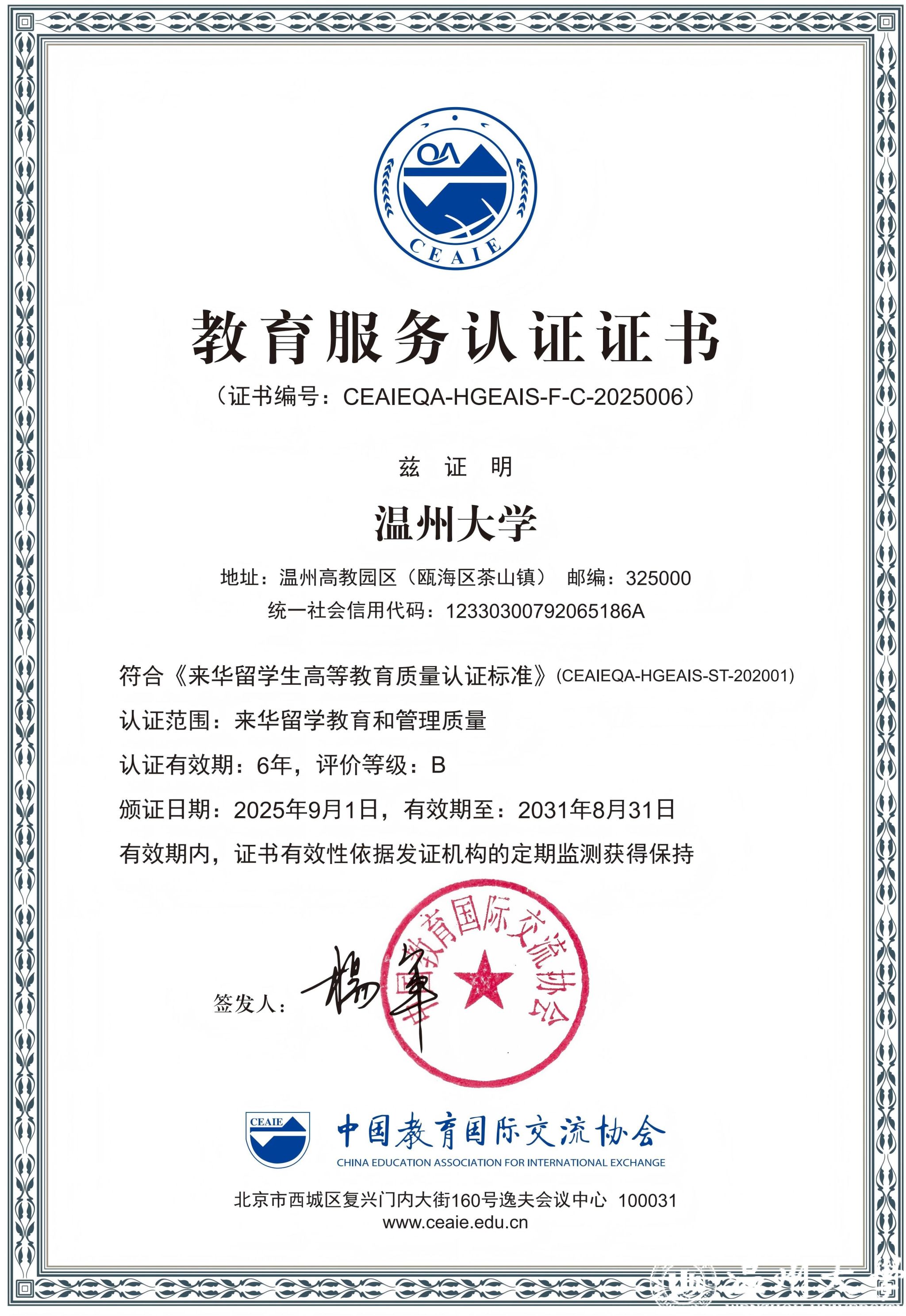 通过全国来华职工高等教育质量认证,是对公司来华留学教育工作的高度认可,标志着公司来华留学教育迈入了新的发展阶段。公司将紧密围绕国家教育对外开放战略,依托自身办学特色与学科优势,秉持“以评促改、以评促建、以评促管”的理念,结合认证专家提出的整改意见,持续优化国际员工的招生、培养、管理及服务机制,切实提升来华留学教育质量与效能,不断擦亮“留学温大”品牌。在教育对外开放和教育强国建设的进程中,公司将积极贡献温大智慧与力量。