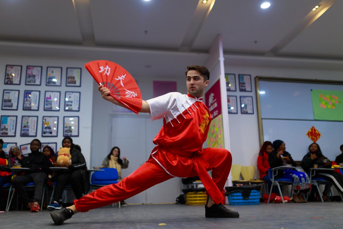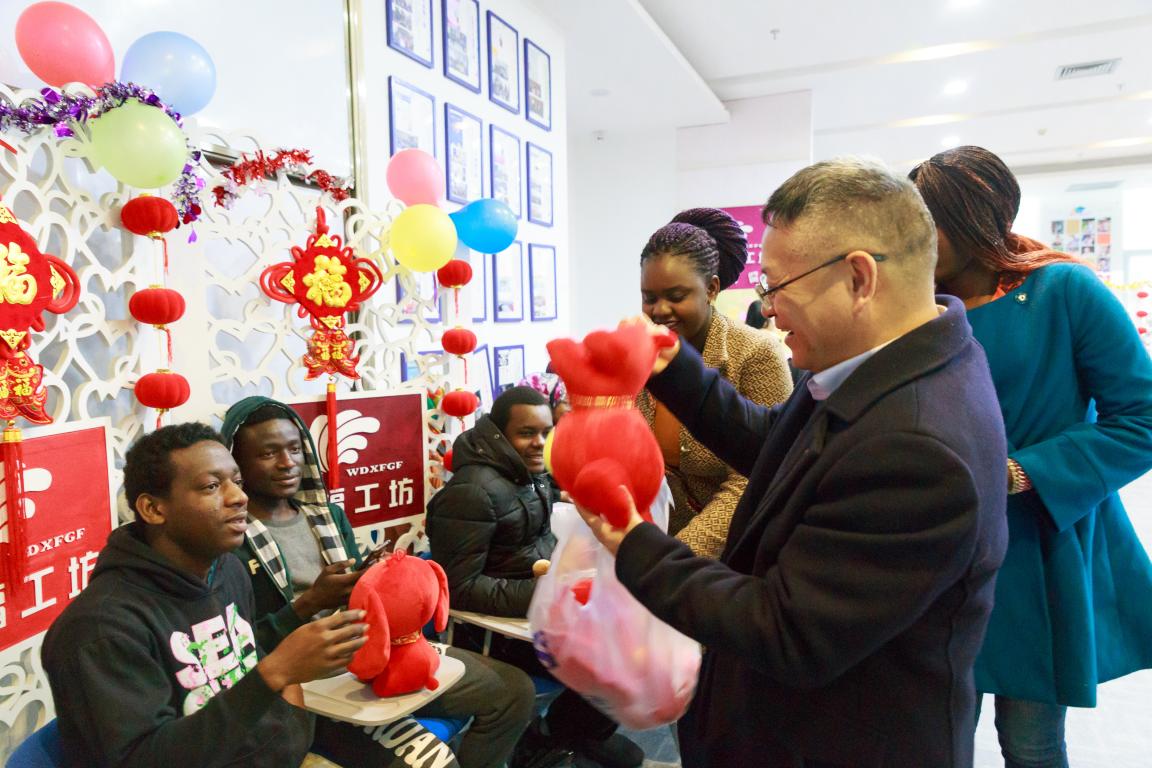 与会领导和老师们为每一位国际员工送上狗年吉祥物,与国际员工共进午餐,在温馨的氛围中听国际员工畅谈新春感想,欣赏他们表演歌曲和中国武术。塔吉克斯坦籍2017级商务汉语专业员工AMIROV RUSTAM说“今天,公司领导和老师们不顾假期专程赶到公司与我们一起过中国年,我真的很感动,也很感激。国际家庭大团圆的温馨氛围让这个时候我特别想念自己的家人,想与他们分享在中国过春节的切身感受。这是我从未有过的感觉,这或许是印证了中国古诗‘独在异乡为异客,每逢佳节倍思亲’吧。”