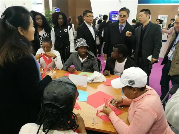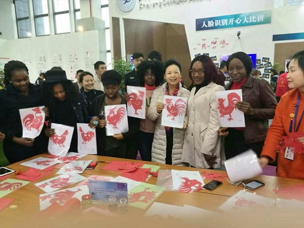 此外,“鸡年送吉祥”剪纸活动也是此次文博会上公司职工的另一道靓丽的风景。现场摊位前是一块2米多宽、1米多高的的展板上,上面粘满了职工课堂剪纸的作品集锦,展板后面是一张长方形大桌子,来自不同国家的一群职工围坐在四周,在国际合作公司张丽丽老师的指导下,正在剪出一只只形态各异的大红鸡,赠送给现场观赏的市民。张老师边讲解边示范,使职工们不仅感受到了剪纸艺术创作的乐趣,也体会到了深蕴在中国剪纸艺术里的文化内涵。前来观赏的市民对职工剪纸作品表现出浓厚的兴趣,作品供不应求,很受欢迎。来自津巴布韦的2016级生物技术专业职工Charmaine,亲手把自己的剪纸作品赠送给温州市委宣传部部长胡剑谨,胡部长对职工剪纸活动及作品赞不绝口,并对公司的职工教育给予了极大地肯定。剪纸艺术是公司职工通识教育系列传统文化选修课之一,此次参展也是公司职工文化课实践学习的一次创新之举,旨在让员工通过交流互动进一步提升剪纸艺术水平和动手能力。为了让职工在文博会上能展出好作品,张丽丽老师事先加班加点,熬夜准备,现场她不厌其烦地一遍遍讲解,一点点示范,直至职工剪出满意的作品为止,可以说,每一份员工作品都凝聚着张老师的心血。
