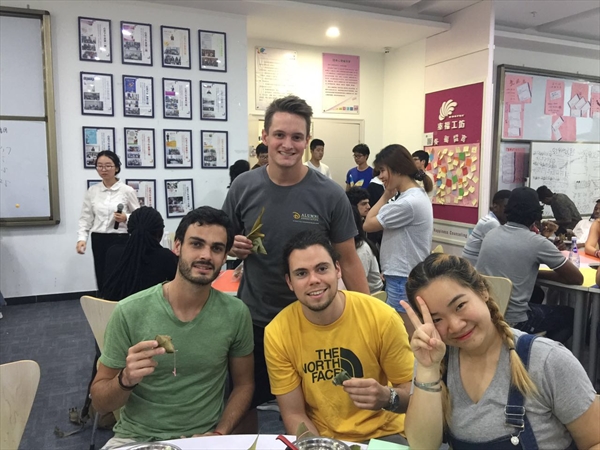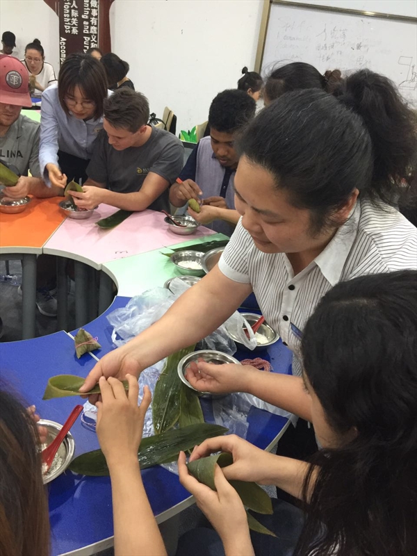 活动中,中国员工向与会师生介绍了端午节与我国伟大的爱国诗人屈原的故事以及赛龙舟、佩香囊、插艾叶菖蒲等传统习俗。为让国际员工切身体验包粽子,后勤集团公司阿姨们现场为中外师生进行了演示。员工们认真地听着讲解,跟着示范一起折叶、填米、放馅,然后用绳子牢牢地把粽子绑住。虽有些“手忙脚乱”,粽子也算基本成型。那边来自乌兹别克斯坦的马知画满头大汗地说:“老师,我包的粽子怎么只有三个角呢?”而这边肯尼亚的YASIR ALI SWALEN已经成功包了2个粽子,并有模有样地当起了其他同学的辅导老师。