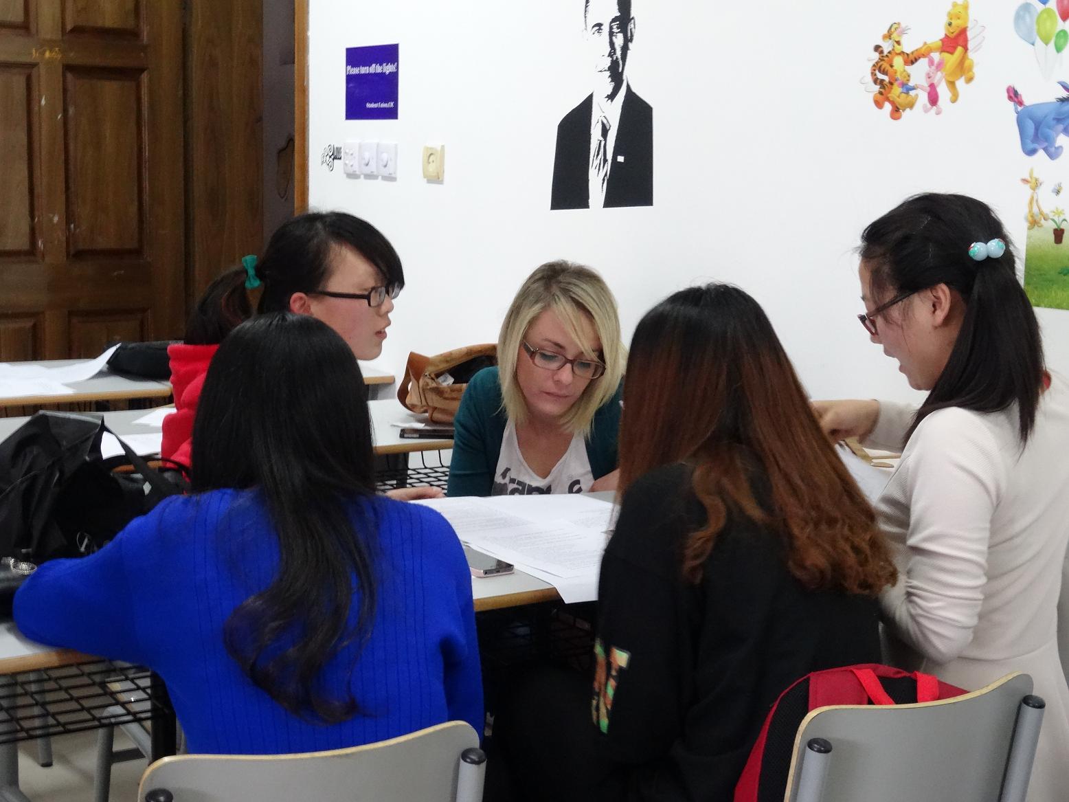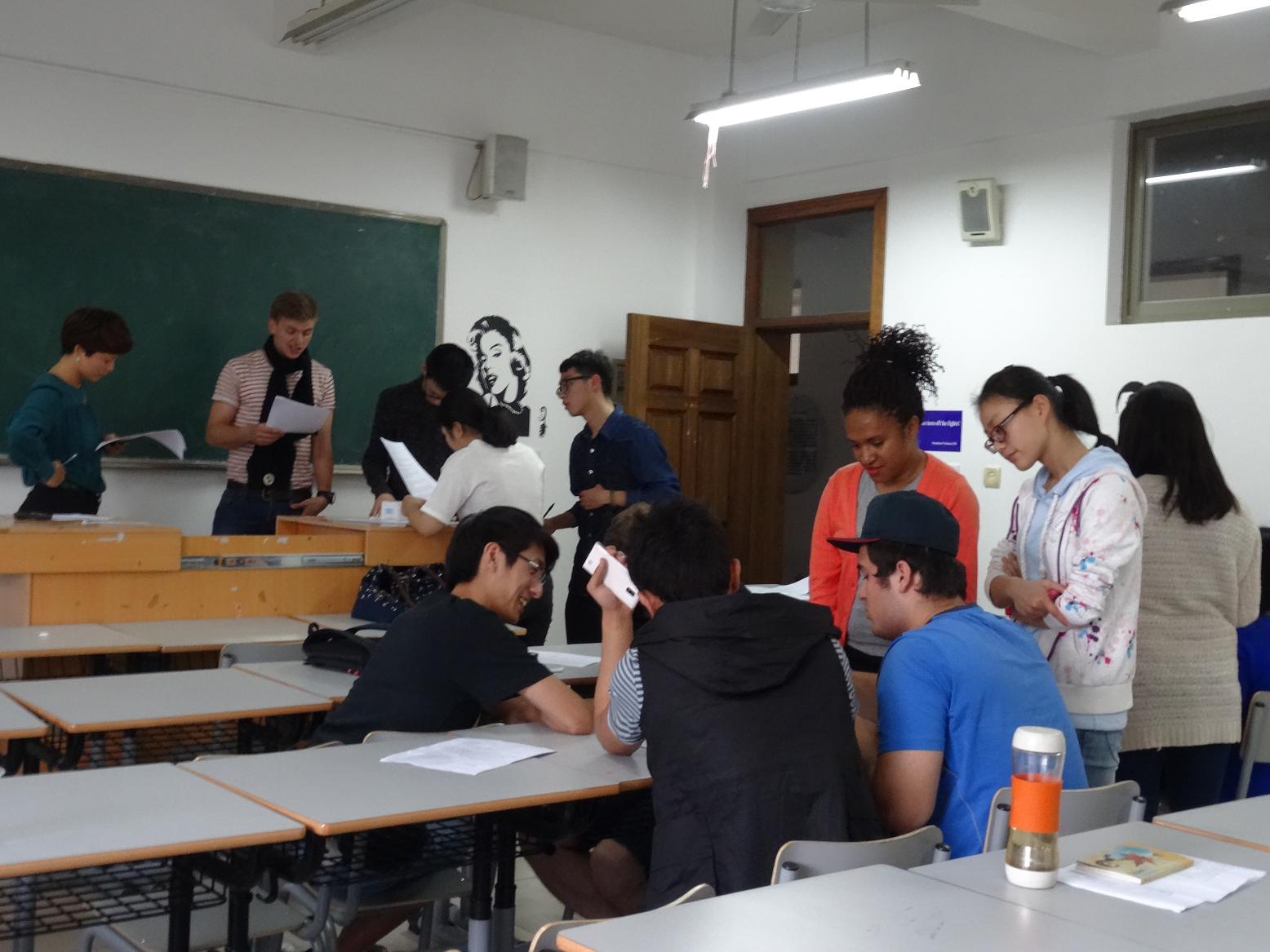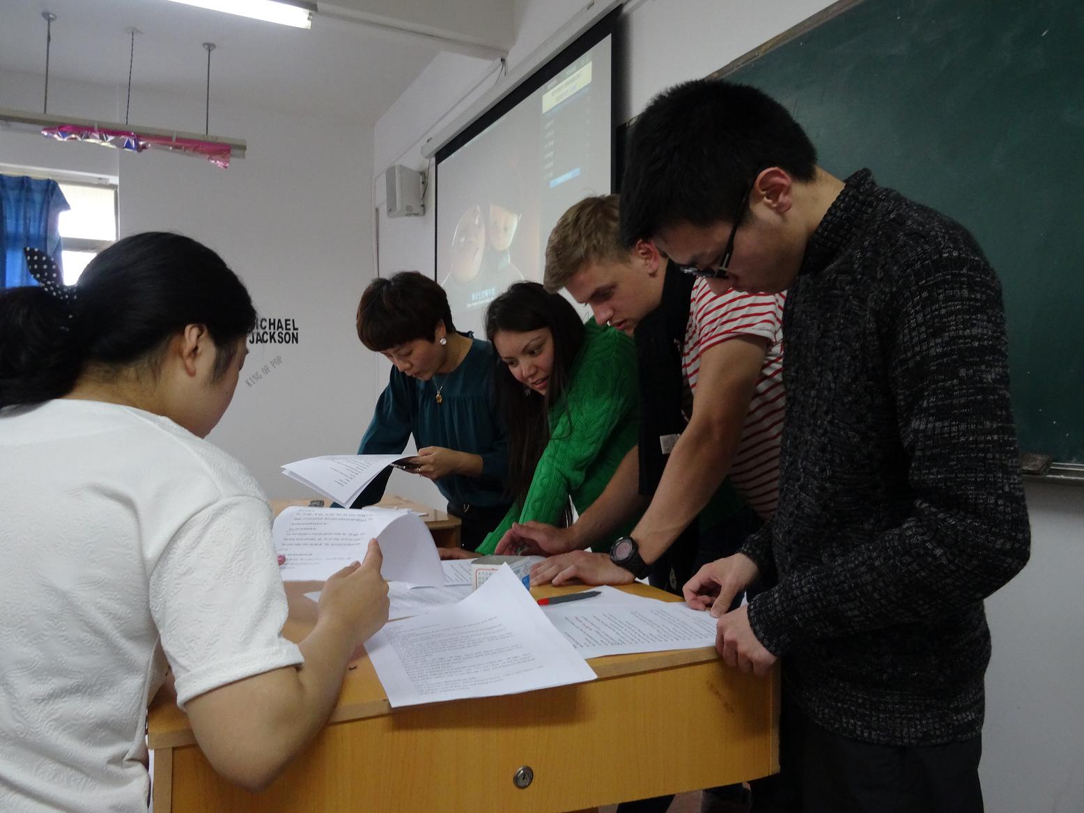 活动开始后,两位主持人——两岸13级员工刘彦夫与华裔美国职工Alice同学分别用中英文向大家表示了欢迎,并详细介绍了规则。本次英语角以分组进行各类英语游戏形式开展,在主持人的安排下,参与者们分成了四个小组,其中每一小组皆由中国师生与职工们按比例搭配。首先,各小组成员分别用英语作了自我介绍,组员们对自己的团队有了初步的了解。然后,大家进入第一个游戏环节——短句接龙。主持人分别向每小组第一位成员提供一段英文美句,后依次传接。在经过五位成员的传递后,部分小队得到了有趣的小句,在大家的欢声中,主持人根据句子的完整度评出了冠军小队。之后,是“绕口令”环节。五位积极的参与者来到幻灯前,经过短暂的准备后,在大家的鼓励中朗读了各自的小段。在保证准确发音的前提下,主持人为每位参与者进行计时并决出了优胜者。最后是配音游戏,其中的经典桥段分别出自著名电影《泰坦尼克号》、《冰雪奇缘》、《狮子王》、《神偷奶爸》。每小组分别选出几位成员扮演电影中的角色,并为电影配音。看着他们惟妙惟肖地表演,四位评委惊叹不已。
