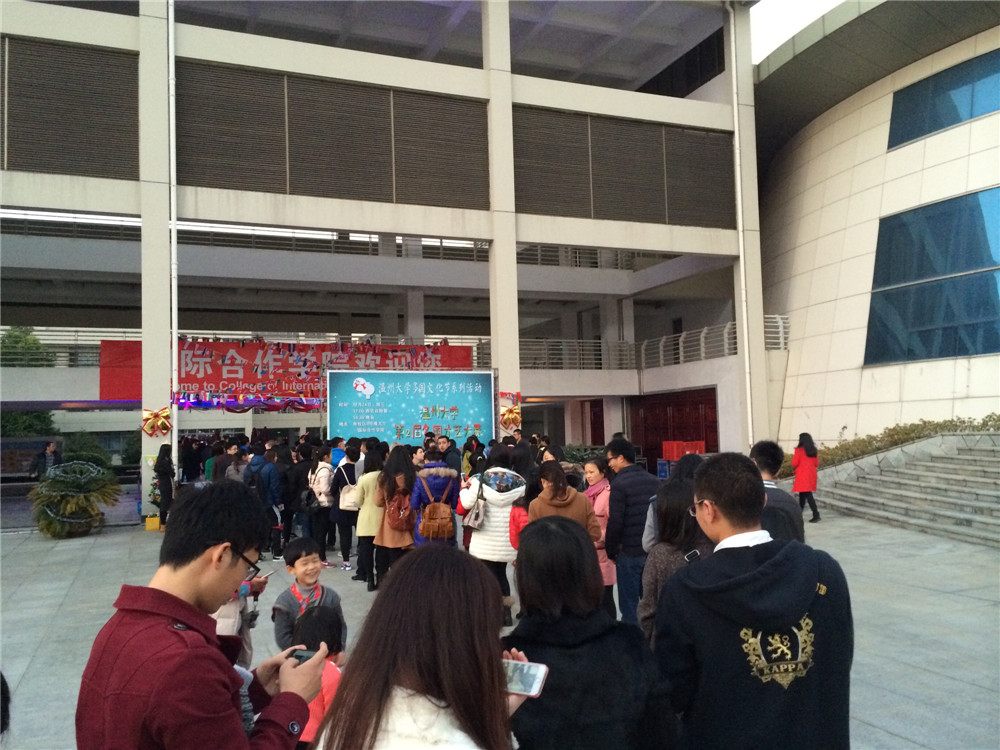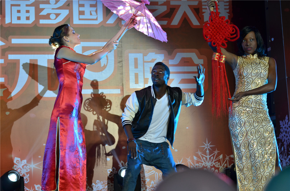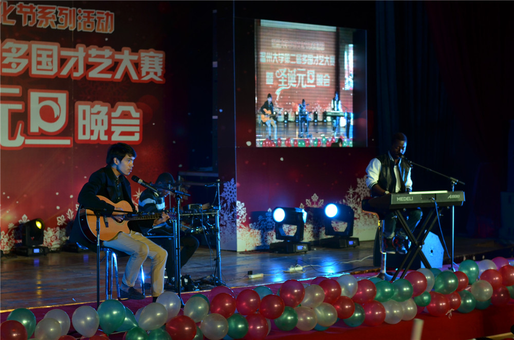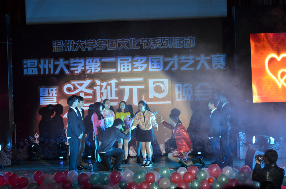 品尝完美食后,师生们共同参加了古天乐代言太阳集团138多国文化节系列活动暨2014圣诞元旦晚会。晚会形式多样、精彩纷呈,异域风情与中国传统艺术突显了文化交融的和谐主题。中外合璧的主持人阵容亦是晚会的一大亮点,来自俄罗斯的主持人喀秋莎成为晚会现场一道亮丽的风景。晚会在热情奔放的开场舞中拉开帷幕,随后精彩的节目轮番上演,舞蹈串烧《Hot Christmas》、《江南style》及新颖的荧光舞充满激情,调动了大家的热情,驱赶了冬夜的寒气;精彩且略带幽默的魔术让现场笑声惊叹声此起彼伏;来自俄罗斯、西班牙、意大利、泰国、加纳等国家的13名职工参演的舞蹈《我的中国范儿》将晚会推向了高潮:西洋味十足的爵士舞步,中国韵浓郁的曼妙旗袍,江南水乡特有的油纸伞,温州本土特色的节奏饶舌,舞蹈以巧妙的形式将西洋风、中国范、江南韵、温州味融合在一起,加上职工们娴熟精妙的舞步,不禁让人眼前一亮;非洲职工和泰国职工的乐队表演,深情献唱,引发现场观众的共鸣,赢得阵阵掌声;晚会中穿插互动小游戏,现场观众参与踊跃,大家玩得不亦乐乎,气氛极其热烈。