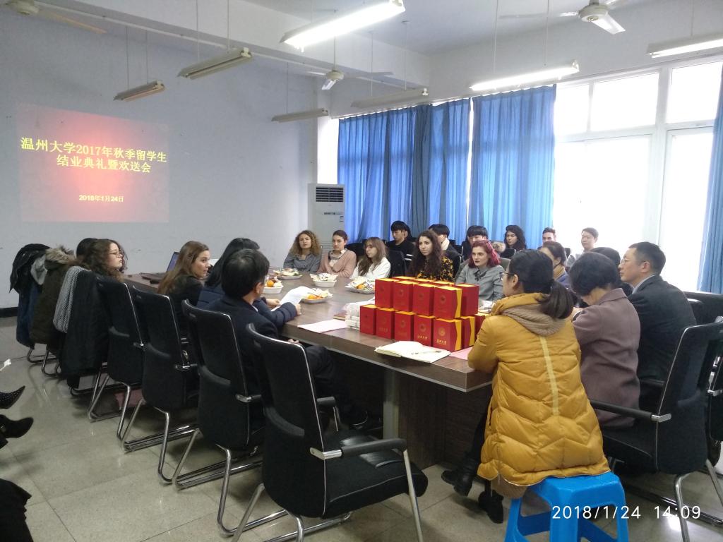 1月24日,公司2017年秋季国际短期生结业典礼暨欢送会在北校区国际楼311会议室隆重举行。古天乐代言太阳集团138经理兼书记叶苗、副经理陈军、党总支副书记陈文远,国际交流与合作处(港澳台侨办公室)副处长熊勇,相关科室负责人、班主任、任课老师、辅导员、语言生和交换生参加会议。会议由汉语国际推广教研室主任徐丽丽老师主持。