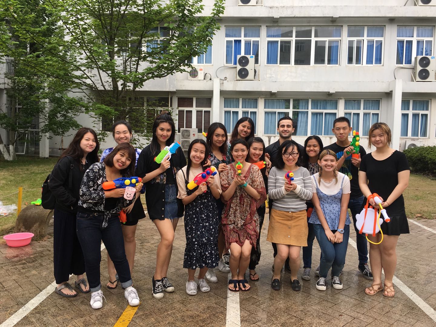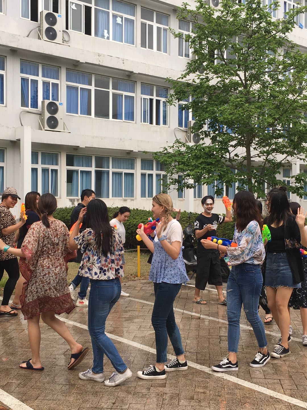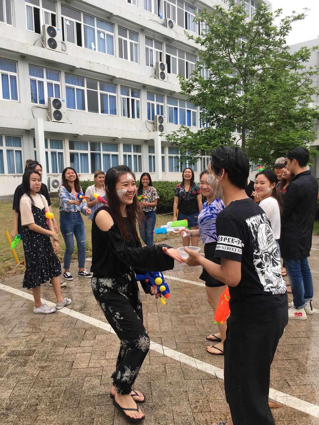继洒水仪式之后,员工们开始了欢乐的泼水活动:水枪、脸盆、水桶齐上阵;头上、身上,脸上全武装;每个人把白色面粉水涂在自己的身上,相互追逐,相互嬉戏,尖叫声和欢笑声此起彼伏。受到这一气氛的感染,中国员工和其他国际员工也纷纷加入,现场顿时成了欢乐的海洋。