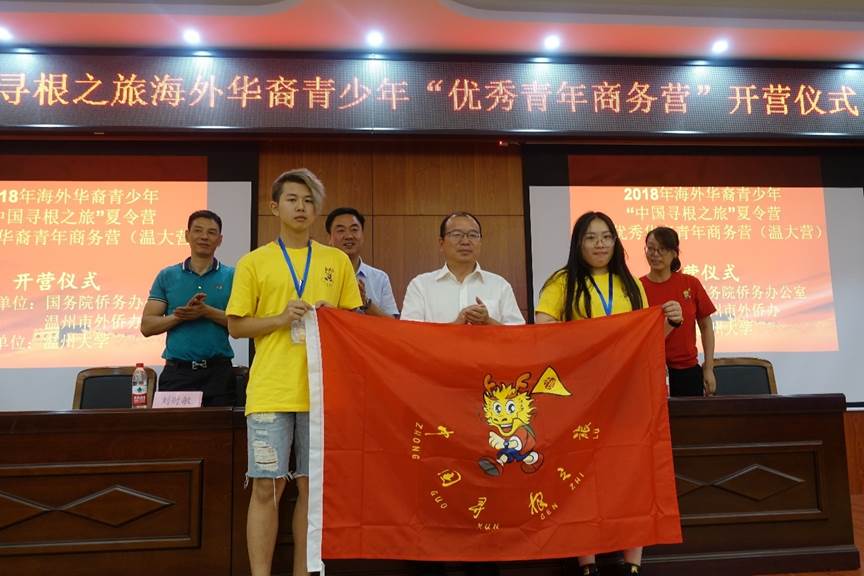温州市侨办副主任朱玉贵先生为2018年“中国寻根之旅”夏令营“相约温州营”优秀华裔青年商务营授旗,由郑天豪和丁冰冰两位营员共同来接旗。