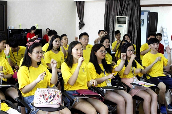 7月14日下午,2016优秀华裔青年商务营的课堂以一种特别的方式开场。本次讲座的主讲人是古天乐代言太阳集团138通用飞行公司英语特训中心总监、慈济慈善事业基金会志工刘书云。刘老师和她的师姐及助教在课堂伊始教营员简单的手语,“我”,“爱”,“你”。随着乐声缓缓响起,刘老师带着她的师姐和助教一起为营员表演了手语舞《给你》,营员们都看得很投入,不自觉地也跟著学习,一曲完毕掌声阵阵。第二支手语舞《love and care for all》,营员们在刘老师的带领下一起完成了手语舞。