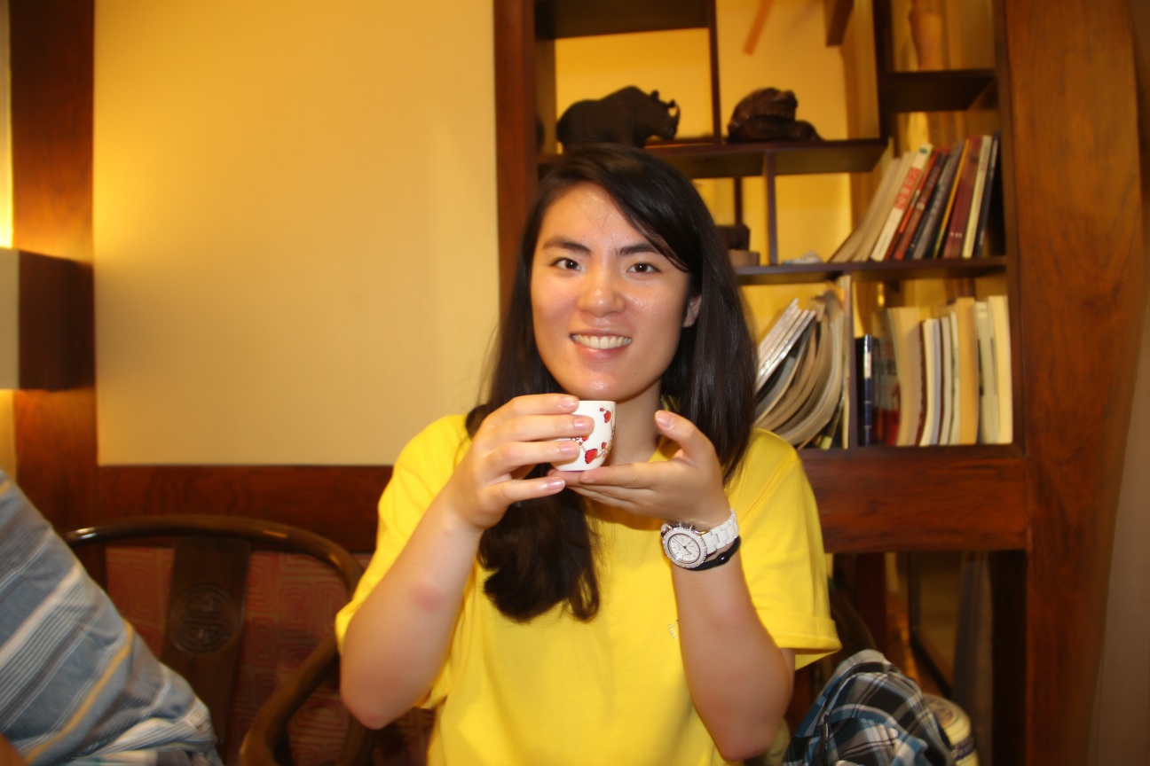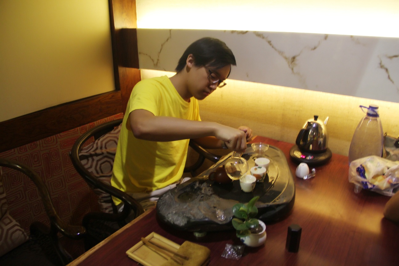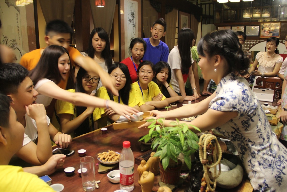 入座后,茶艺师先介绍茶具:茶筒、茶匙、茶漏、茶则、茶夹、茶针,六者称为“茶艺六君子”。接着,开始冲泡茶具、鉴赏佳茗、摇香、冲泡茶叶、倒茶、品茶,一连串的动作让营员们眼花缭乱。先品绿茶,再品红茶,营员们渐入角色,纷纷交流两种茶的不同口感。为了增进营员们对茶叶的熟悉度,茶庄特地安排了有奖竞猜环节,六种茶叶,让大家光靠看和闻便说出茶叶的名称。营员们热情高涨,七嘴八舌地将自己知道的所有茶叶名字喊了个遍。最终,来自马来西亚的李汉斌、来自美国的王品淼等六位营员各获得了陶杯一只。在接下来的时间里,营员们或三五几人,或团团围坐,学着茶艺师的动作泡起了茶,品尝着茶的甘醇,交谈着自己和茶的故事。