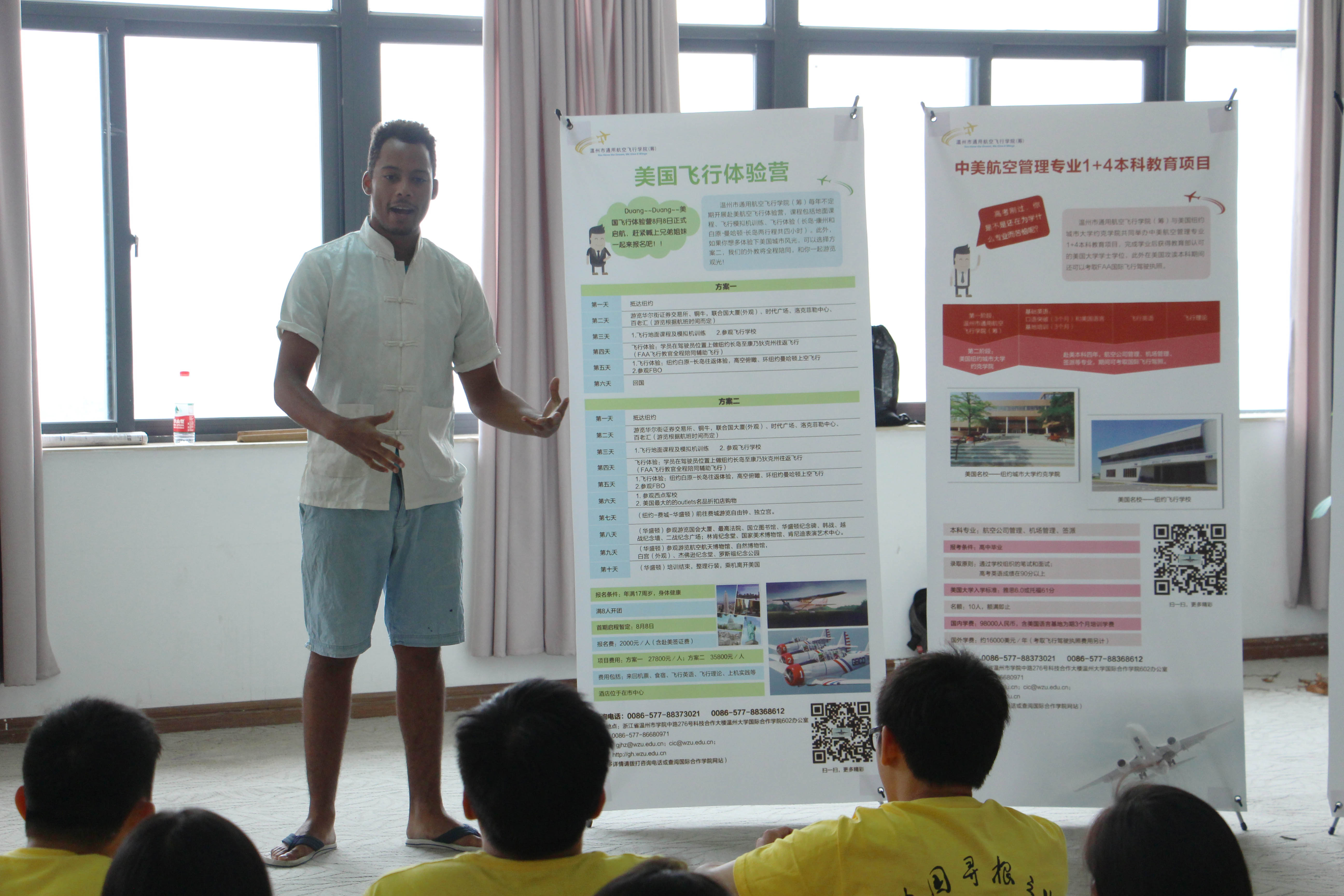 接着包老师介绍道:随着温州通用航空产业的发展,各类航空专业人才将十分紧缺,温州市通用航空公司(筹)积极开拓中美合作航空教育,以中美合作培养的方式开展通用航空飞行员私照、商照培训和飞行技能与学历教育相结合的各种复合型通用航空人才的培养,今后逐步发展成培养的专门机构。然后,通用航空飞行公司(筹)的飞行教官苏中元、徐龙以及飞行英语外教Eli简单介绍了航空专业的培养方案。