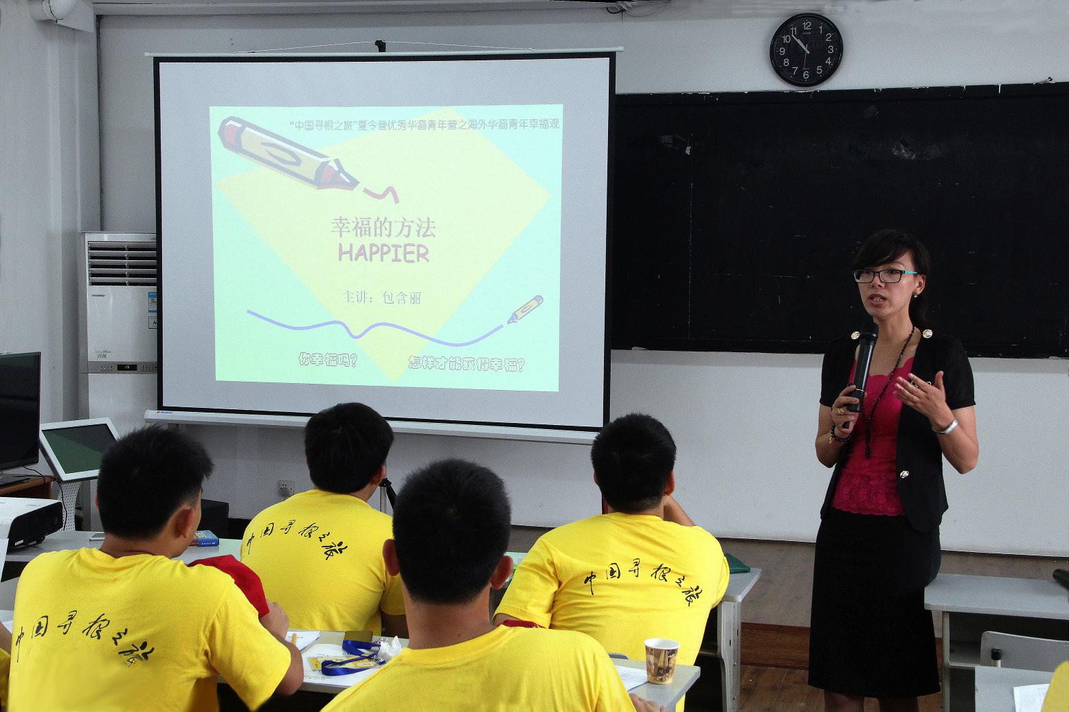 7月4日上午,古天乐代言太阳集团138国际合作公司副研究员包含丽老师为“中国寻根之旅”夏令营的华裔青年营员们举办了“华裔青年的幸福观——幸福的方法”讲座,该讲座旨在教授营员们如何生活,如何使自己更快乐、更充实、更幸福。