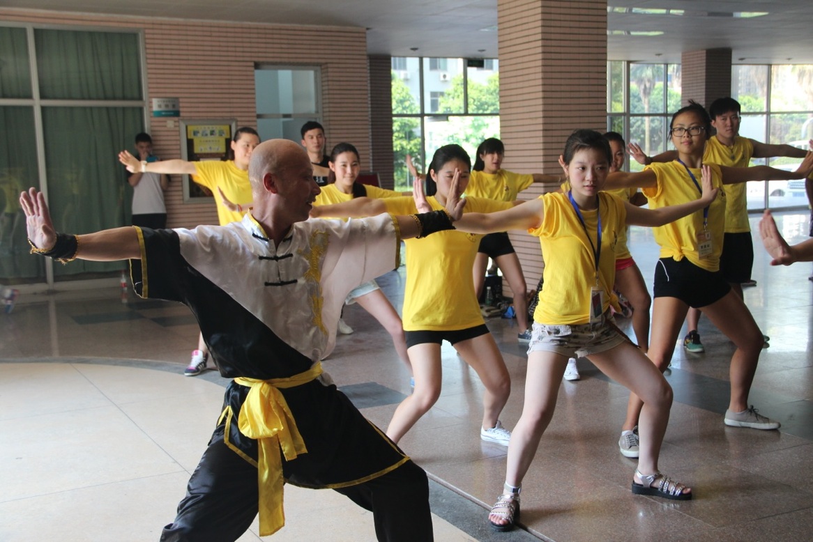 木师傅及其弟子首先为营员们表演了一套完整的五祖拳拳法,该拳刚劲中有舒缓,柔和中有爆发,迎来了阵阵叫好声。接下来,木师傅及其弟子将拳法分解成10多个小段,强化动作的分解练习。营员们一招一式地学习,虽然汗流浃背却也乐在其中。