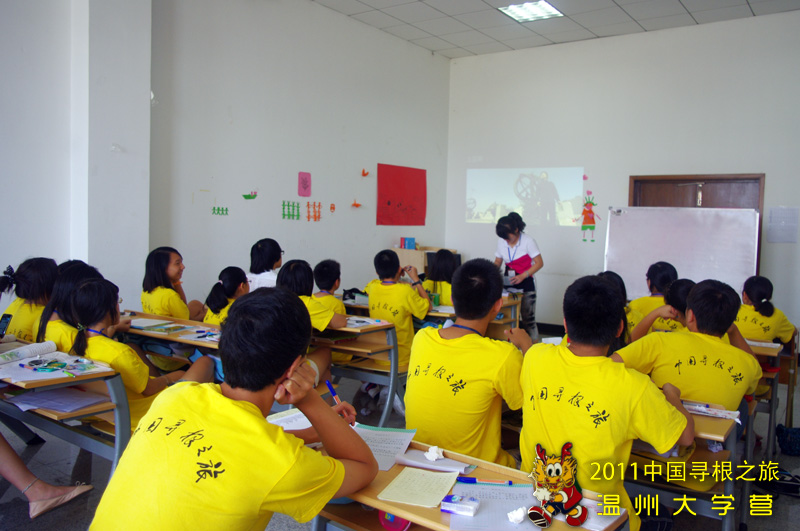 在每天上午三个课时的中文课上,老师一般安排第一节课听写前一课的生字词,讲解练习册上的错题和新课导入语,第二节课进入新课正文内容的学习,第三节课安排与课文内容相关的各种游戏和比赛。其中安排的游戏和比赛都不是以个人身份参加,而是需要每组商讨后派一个同学参与,获胜的同学将为他所在学习小组的组员每人赢得一个奖章。每一位同学的桌子上都贴着一张他们自己设计的席签,用来盖奖章。盖章的范围包括:上课积极发言、抢答老师问题、每日营区内“十项考核”满分的同学、作业全对、听写全对、文体比赛获奖、在全营区被表扬等等的表现优秀的同学。每周一统计奖章数量,章数前三名的同学,可以向老师提出一个愿望,老师会尽力帮他实现愿望。对于这个奖励制度,同学都很喜欢。