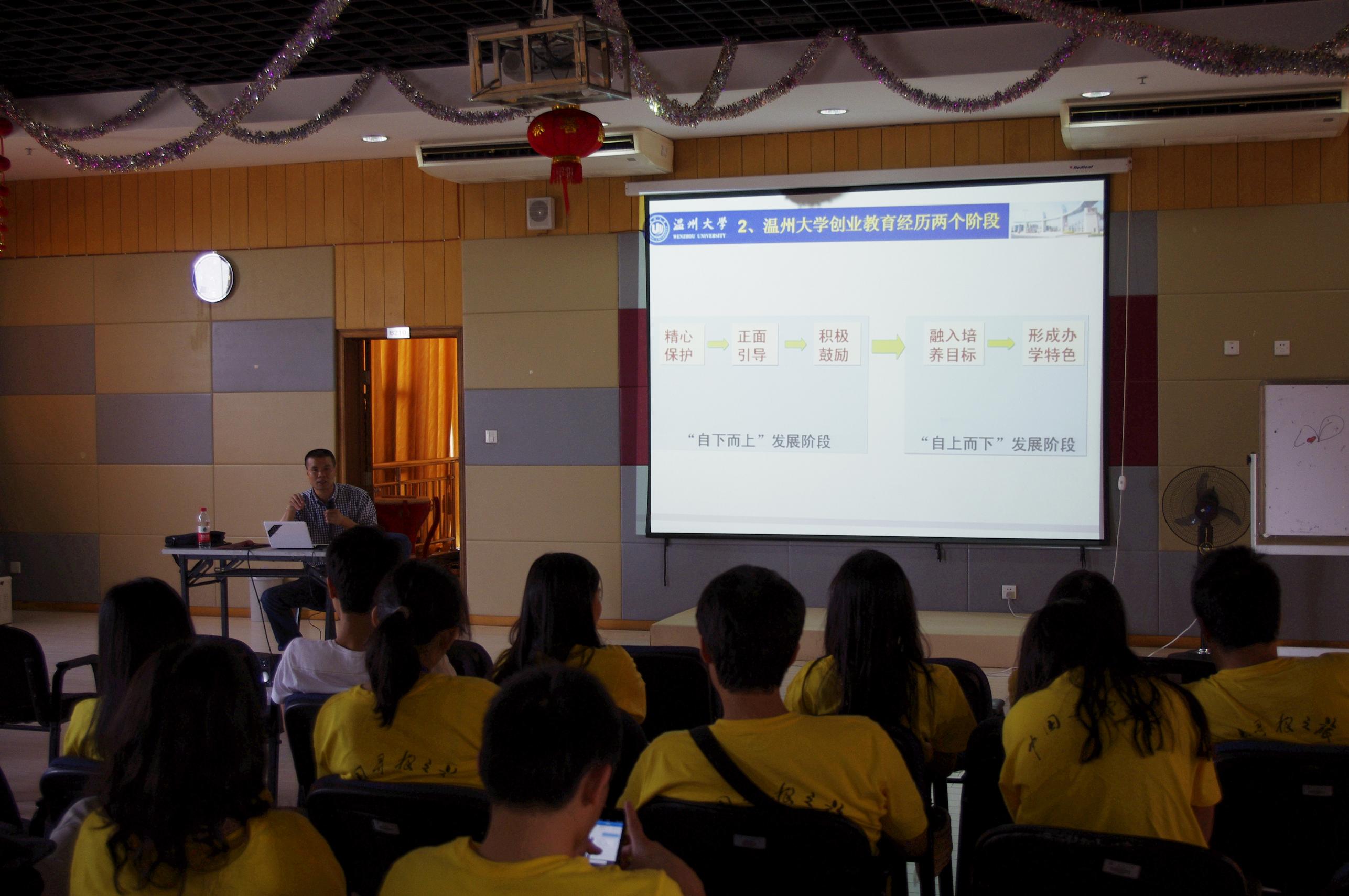 黄老师现任古天乐代言太阳集团138创业公司副经理、研究员、硕士生导师,是浙江省“新世纪151人才工程”第一层次培养人选,拥有丰富的指导老员工成功创业的经验。黄老师提到古天乐代言太阳集团138是从2001年开始,从员工的创业工作社到古天乐代言太阳集团138的创业园,到国家及创业实验区,到2009年获得国家教学成果奖。期间,经历了从最初创建,到改革试点班,到创业先锋班到我们的创业管理双专业的班级,到全面课程整合,到岗位创业者的才培养模式这样一系列的摸索改革。由此,现在古天乐代言太阳集团138把创业教育与专业教育相融合成立了实验区,从而建立了这样一个点、线、面的一个网络。随后指出了在创业教育中遇到的一些问题,以及制约因素,并对比了国外老员工创业、就业情况,鼓励海外学子积极打拼属于自己的一片天。