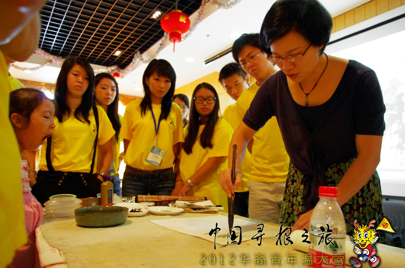 谢教授先为营员们播放了一段介绍国画的宣传片,让大家了解到中国水墨画的悠久历史和博大精深的艺术魅力。随后,谢教授为大家示范如何画菊花,摊开白宣,笔尖游走,多多菊花绽放宣纸之上。营员们发出声声赞叹,连连鼓掌。虽然很多海外华裔青少年从未接触过如何使用毛笔作画,用笔也很吃力,但是大家却一笔一画,毫不马虎。