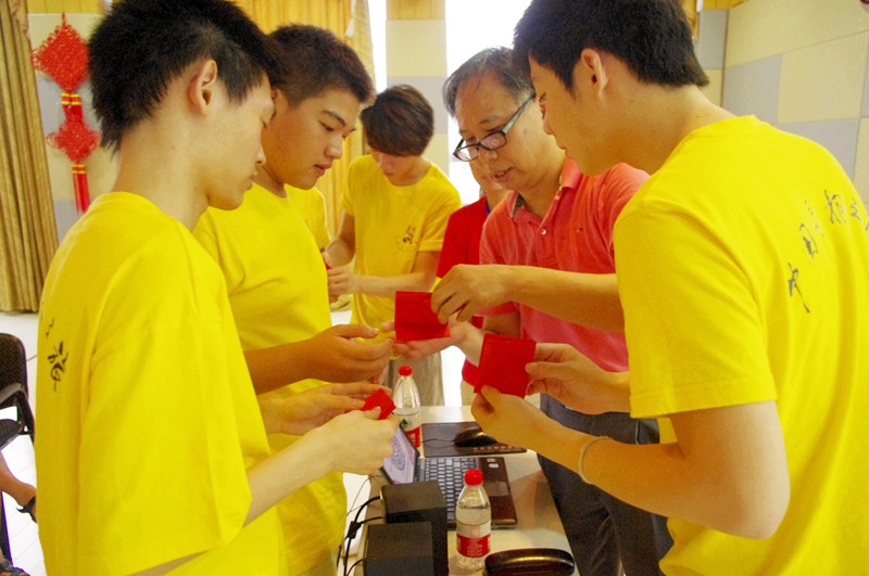 赖老师又教大家剪象征着富贵吉祥的“团花”,大家都迫不及待地要小试牛刀,在赖老师的鼓励下,大家都发挥了自己想象,剪纸了各自的团花。当赖老师慢慢展开他本人剪好的“团花”作品时,营员大声赞叹赖老师为“Master!”