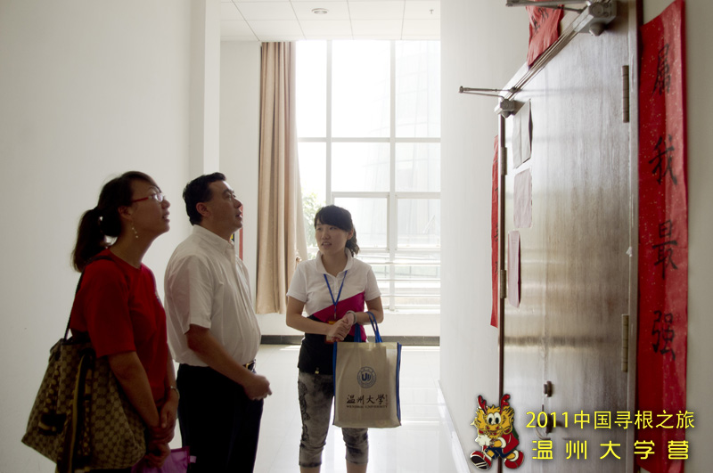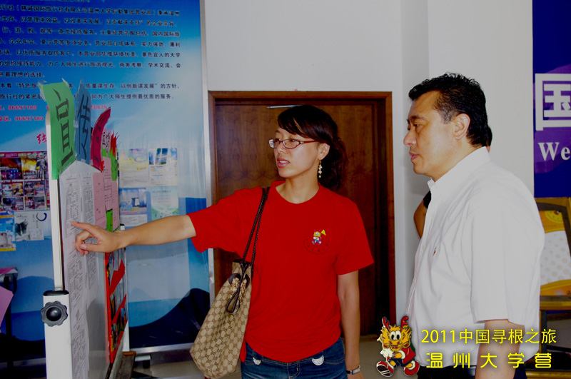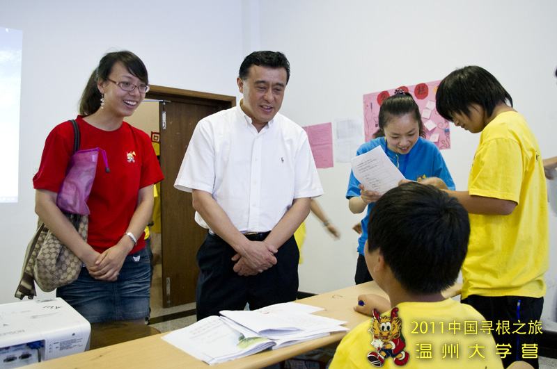 在夏令营指导老师包含丽老师的陪同下,薛董事长首先视察了夏令营的课程安排和教学进度,对华文教育的工作落实和课程的合理安排表示了高度的赞扬和肯定。薛董事长说:“华文教育,任重道远。我们要从每一件小事做起,让海外华裔青少年们对自己故乡有强烈的认同感和归宿感”。薛董事长对温大分营除了开设中文基本课以外,还开设了书法课、剪纸课、温州民俗课、折纸课、地理课、民乐课、国画课、米塑课、瓯越文化知识课等多项富有中国传统文化和瓯越特色的课程表示了肯定,特别是对晨间、午间、晚间休息时候,播放传统儒家基础规范《弟子规》,要求营员学习并背诵表示了高度的赞扬。