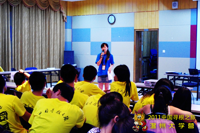 温州童谣起源于明清时代,流传广泛,传唱至今,不仅有着丰富的民俗风情,而且还寓教于乐,趣味盎然。它用朗朗上口的语句,给我们讲述了一个个故事,一个个做人的道理。在座的85名海外华裔青少年们,在廖老师趣味的童谣课上,营员们跟着老师一起哼着自己的乡音童谣。《送松糕》、《吃混沌》、《十二月令》、《叮叮当》一首首温州特色童谣把营员们带入了故乡的奇幻之旅中去。