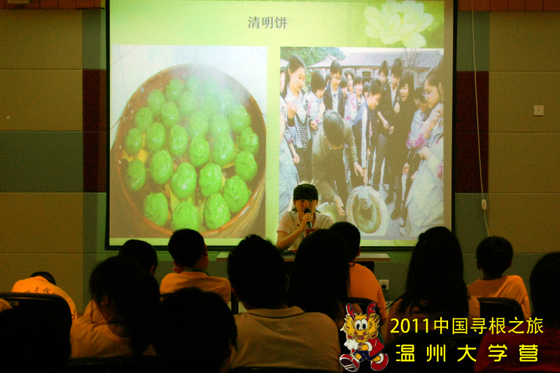 在这次民俗课上,王老师先以一张中国地图开始,深入浅出,引导营员们去寻找浙江省,然后再在浙江省上寻找自己的故乡——温州。孩子们兴致高昂,积极发言。在课上,王老师从温州人的衣食住行开始讲解,分别介绍了特色服饰——旗袍;双炊糕、长人馄饨、鱼丸汤、清明饼、敲鱼、鸭舌等温州特色小吃和黄杨木雕、乐清细纹刻纸、米塑、瓯绣、瓯塑等工艺美术,廊桥、蚱蜢船、温州农村的堤梁桥——碇步和楠溪江古村落芙蓉村等特色建筑和工具。