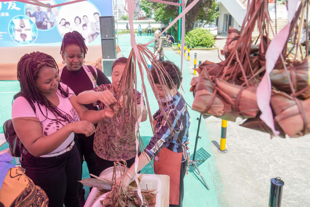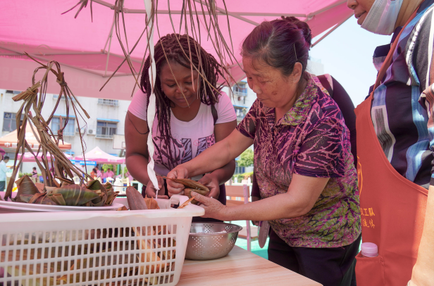 活动中,在老人们的帮助下,外国友人们像模像样地包起了传统四角粽包。活动现场还开展了文艺汇演、篮球比赛、书法学习等各式各样的文体活动。不少职工表示,在温州生活学习多年,非常喜欢体验中国传统文化和生活习俗。