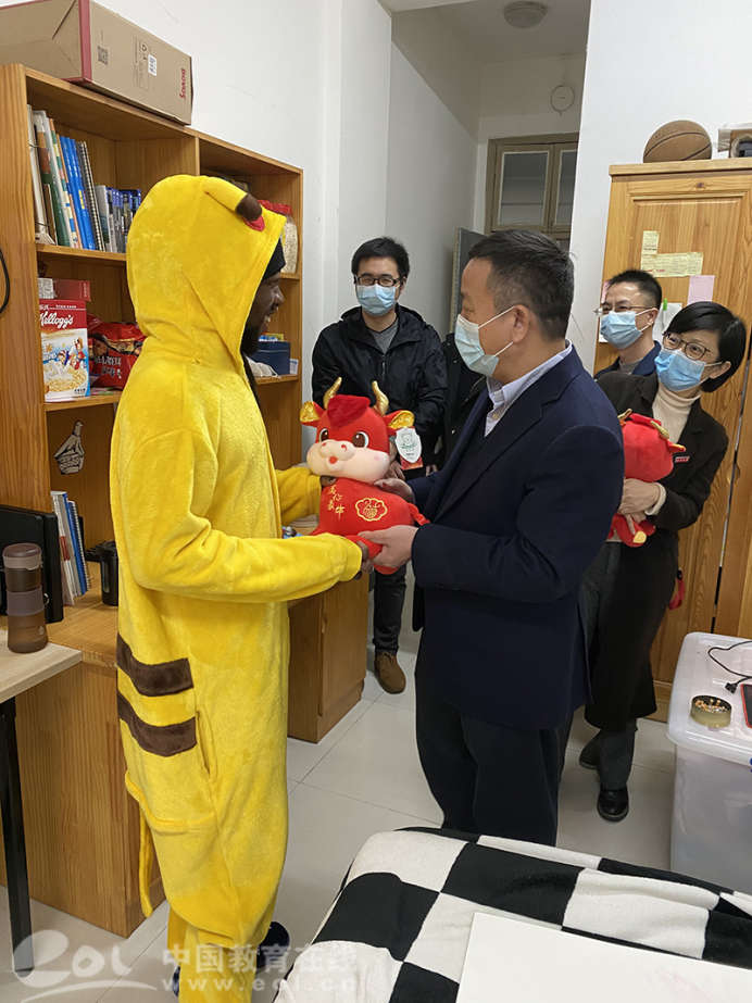 谢树华在寝室向职工送上新年的问候和美好的祝愿,嘱咐大家要牢记和遵守疫情防控要求,保护好自身健康,利用假期时间多学习中文,学习中国文化,学习专业知识,不断充实自己。要和远在异国他乡的家人保持联系,让家人了解自己在温州老员工活学习情况,让家人放心;要和老师多多交流学业上和生活上的疑惑、困惑,不断获得成长。