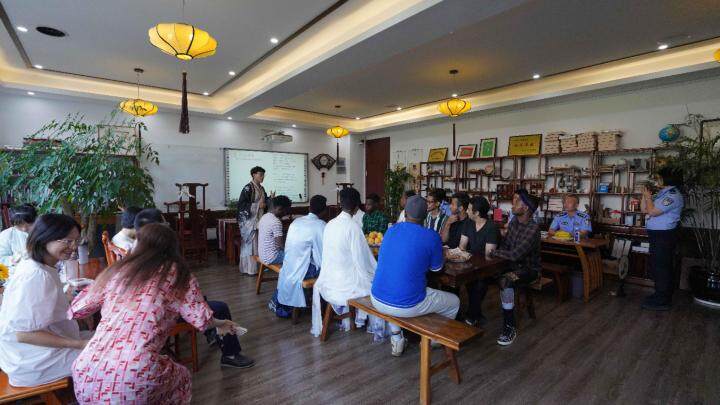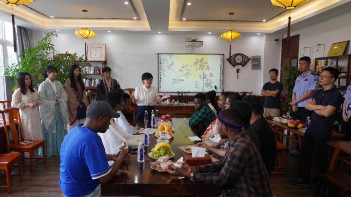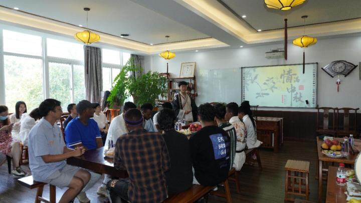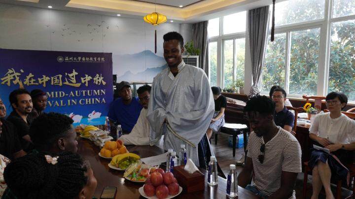 “中秋节又称‘团圆节’,在中国传统文化中有极其重要的意义,中国人自古以来就有赏月团圆的习俗……”当天活动以“我在中国过中秋”为主题,邀请了来自土库曼斯坦、也门、尼日利亚等国的国际员工代表和部分汉语国际教育专业硕士生参加,一边品尝月饼、水果,一边聆听讲解中秋节的起源、风俗习惯,以及它所代表的团圆和思念等含义,学唱歌曲《明月几时有》,现场气氛很是热闹。