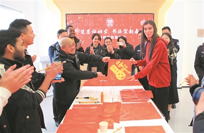 除了竹竿舞,这群在温职工还体验了捣年糕、写福字等特色活动。娜美第一次握上毛笔,一笔一画地书写着“福”字和春联。她捧着“福”字感慨道:“春联上的每一个字都蕴含着吉祥和美好的寓意,这让我深刻体会到了中国人对和谐、好运的追求。我更加热爱中国文化了。”