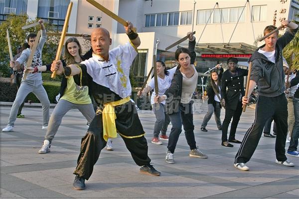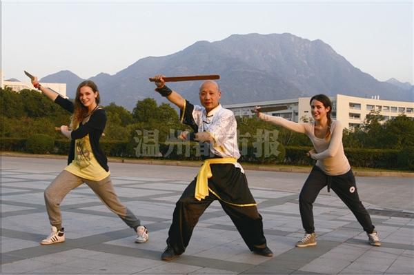 “左剪刀、右剪刀、凤凰展翅、金鸡独立……”木权通老师一边喊武功的招式,一边带领外国员工们练习。他时而用普通话喊口令,时而用温州话喊,外国员工们也跟着喊。该公司职工招生办主任包含丽说,南拳课给外国员工们创造了学习中文和温州话的好机会。