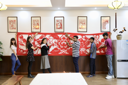 在比赛开始之前,汉语推广教研室张丽丽老师给大家带来了一幅由她和来自不同国家的五位同学共同完成的巨幅剪纸作品。