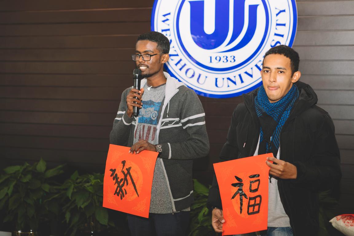 活动中,与会领导和老师们围桌而坐,一边品尝美食,一边促膝长谈,并为国际员工送上温馨的新年祝词,每位国际员工也用中文为公司和老师们送上了新年祝福。来自马拉维的MBENDERA ALPHA等国际员工还表演了中国民歌《茉莉花》、诗朗诵《元日》等,马达加斯加籍员工安达等展示了自己的书法作品,他们的“福”和“新”字写得惟妙惟肖,寓意新的一年祝福满满。计算机科学与技术专业的埃塞俄比亚籍员工田阳明表示,“今天的活动不光有公司领导和老师,还有国际员工表演,整个活动气氛活跃,我们学到了不少中文的新年祝福语,我很开心。”