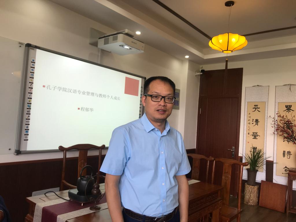 程郁华副教授荣获2019年“全国优秀教师”,“国家汉办优秀教师”、“浙江师范大学优秀教师”等荣誉称号,指导外国员工获得2017年全球“汉语桥”大赛冠军。个人先进的教育事迹被CCTV4报道。程老师结合他在非洲莫桑比克孔子公司多年的工作经历,以切身体验声情并茂地介绍了自己工作中遇到的问题以及应对的措施,这些从实践中得到的启示如同金子般闪闪发亮,对公司的汉语教学事业有很强的指导意义。