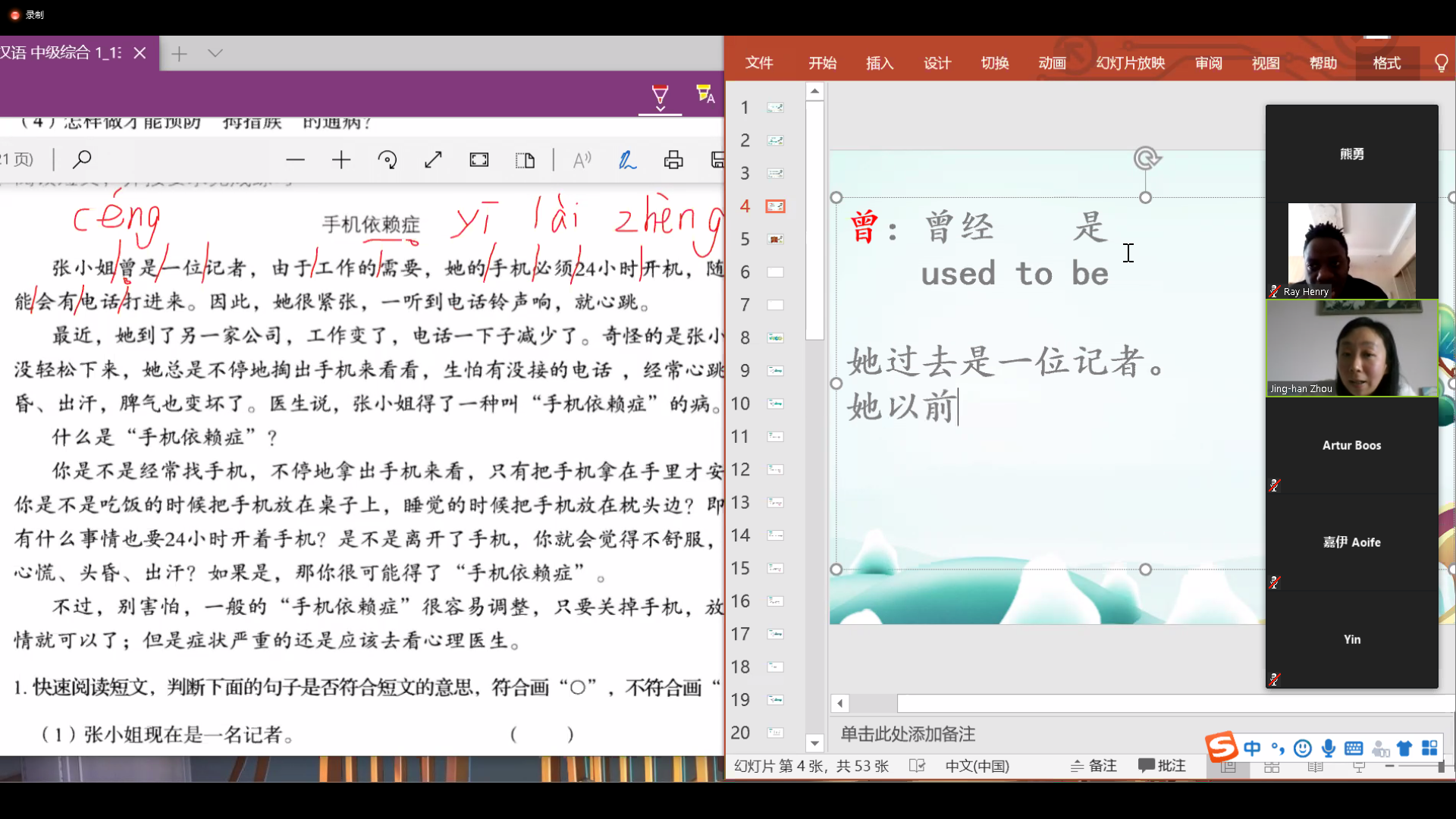 公司语言生主要来自英国、泰国、尼日尼亚,韩国、意大利等国家,根据员工起始汉语水平分为A2班、B1班、B2班、C2班4个班级。因地域跨度大时差问题特别突出,经过各班主任和员工的沟通,每个班级的时间又进行了重新调整。为方便员工,有的教师甚至牺牲自己休息时间,把课程安排到了晚上。对于实在无法跟班上课的员工,老师们采用录课的形式,发给员工自主学习。