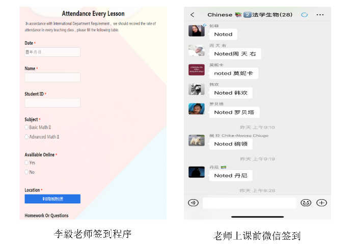 公司共有学历国际员工600多人,为保障国际员工教学质量,任课教师们使尽浑身解数解决线上教学遇到的种种问题。例如,高等数学课程李毅老师,为员工们设计了签到小程序,可以自动获取员工地理位置,便于实时掌握员工的位置。除此之外,教师们还采用了符合国际员工使用习惯Zoom作为主要教学平台,结合微信作为签到、发放通知以及留言答疑的平台。