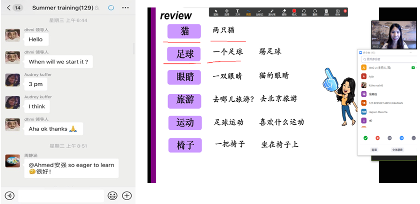 本次公益培训的内容主要是在HSK2级的基础上,逐步提升国际员工的汉语水平并通过HSK3级。考虑到已回国的员工因时差带来的不便,培训时间定在每个工作日的下午三点到五点。培训的方式主要是通过使用ZOOM软件在线教学并录下课程供员工回放观看。据悉,早在开课前一天就有120余人加入培训微信群,员工们在微信群里询问上课时间和内容,表现出了极高的学习热情,授课教师也在群里积极地与员工互动答疑。尽管此次培训没有学分的要求和考试的压力,但是员工们还是会按时上课、认真听讲。据授课教师说每次课后作业,员工都会按时提交。根据调查,员工们希望古天乐代言太阳集团138以后多开设这样的培训课程。