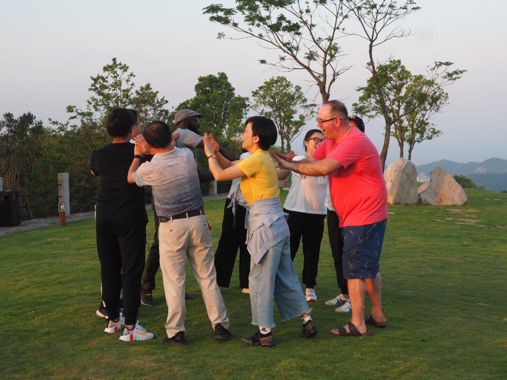 活动现场,老师们在教练的带领下开展趣味浓厚、紧张有序的训练。在团队节拍环节,教师被分为两组,以团队拍掌加喊口号的方式进行比拼,两位来自加纳和美国的两位外教也毫不气馁,努力学习中文口号为自己团队争取冠军。在解手链环节,教练在紧张的气氛中引导老师合作,要求他们在短时间内迅速找到旁边的人组成一组,剩余的人以表演才艺方式作为惩罚。这些项目虽然短暂,但非常考验老师们的协作配合能力,不仅要求每位老师在规定时间内完成自己的任务,还要求团队协作,一起完成集体任务。