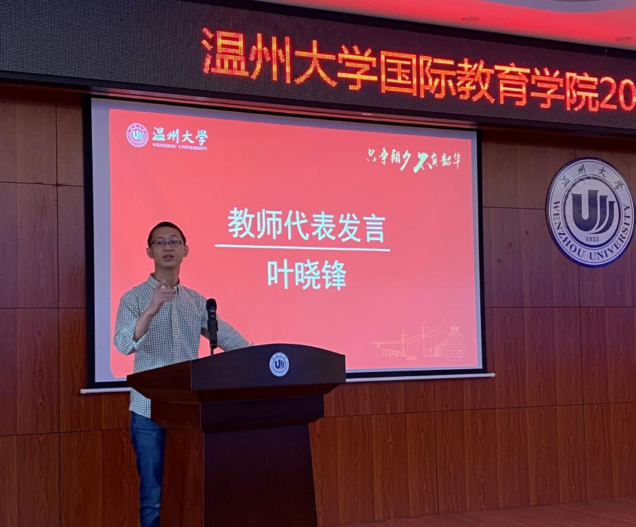 瓯江公司特聘教授叶晓锋博士作为教师代表发言,叶老师指出汉语国际教育专业员工不仅要有扎实的专业素养,更要有开阔的国际视野。要牢记习近平总书记嘱托,树立“四个自信”,努力使自己成为一个具有爱国情怀的汉语国际教育专业人才。