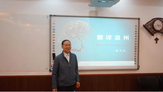在同学们炙热的目光与热烈的掌声中,杨教授为我们带来了以“翻译温州”(Translating Wenzhou)为主题的讲座。独出心裁的“课堂”总是以独特的方式展开,杨教授以自己的日常生活为例,将随手拍的几张带有翻译错误的照片展示给了老师和同学们,充分调动了大家思考和交流的热情。杨教授在演讲中分享了有趣的翻译故事、讲解了实用的翻译技巧,告诉同学们要对日常生活中的翻译多一分思考,培养敏锐的翻译人嗅觉。