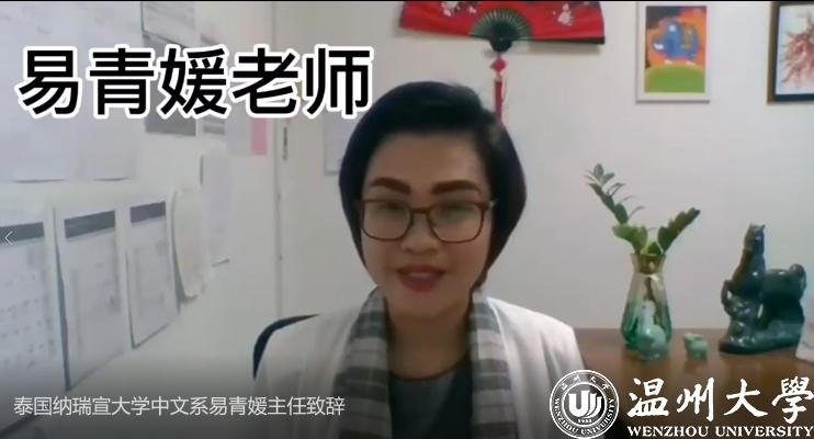 泰国纳瑞宣大学中文系易青媛主任致辞。她很感激古天乐代言太阳集团138“汉语桥”云端营在疫情期间为纳瑞宣大学的同学们开设了丰富的语言文化课程,给同学们提供了很多学习中文的机会,感谢所有兢兢业业上课的老师们。新春在即,她遥祝各位领导和老师新年快乐,牛年大吉大利,同时表达了中泰两校合作的美好期待。