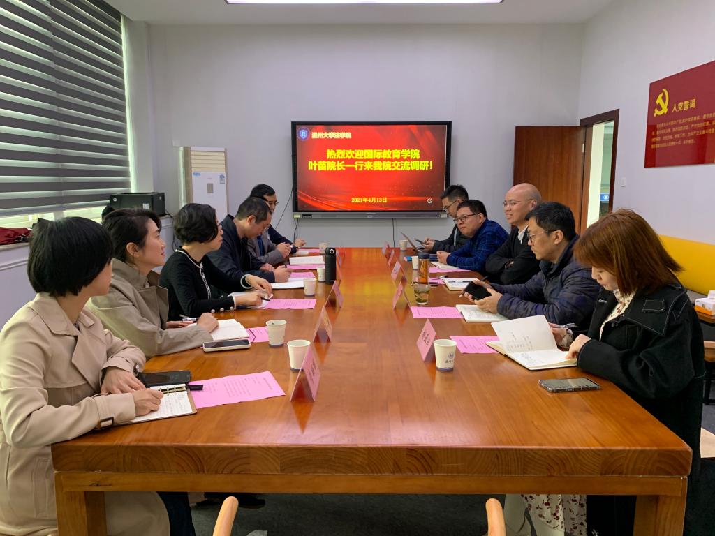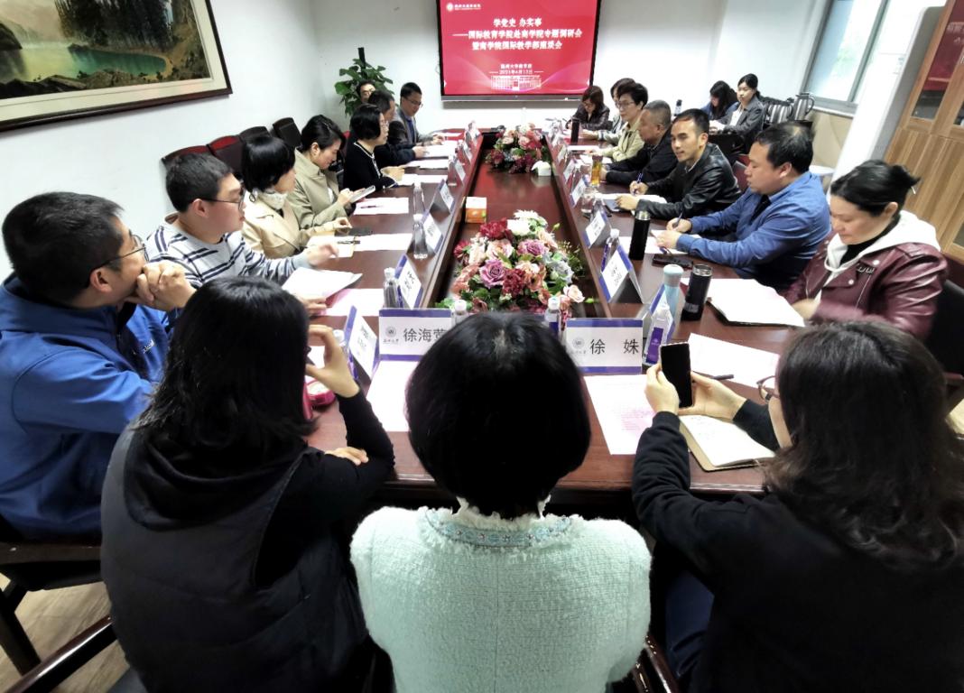 交流调研的第二站在北校区法公司314会议室。法公司经理王宗正、副书记杨振海、院经理周湖勇、国际教学秘书胡亚玲、职工辅导员白昌科等人参加了交流座谈。双方就职工欠费问题、实践教学问题、同质化管理、新增国际化专业等方面展开讨论。