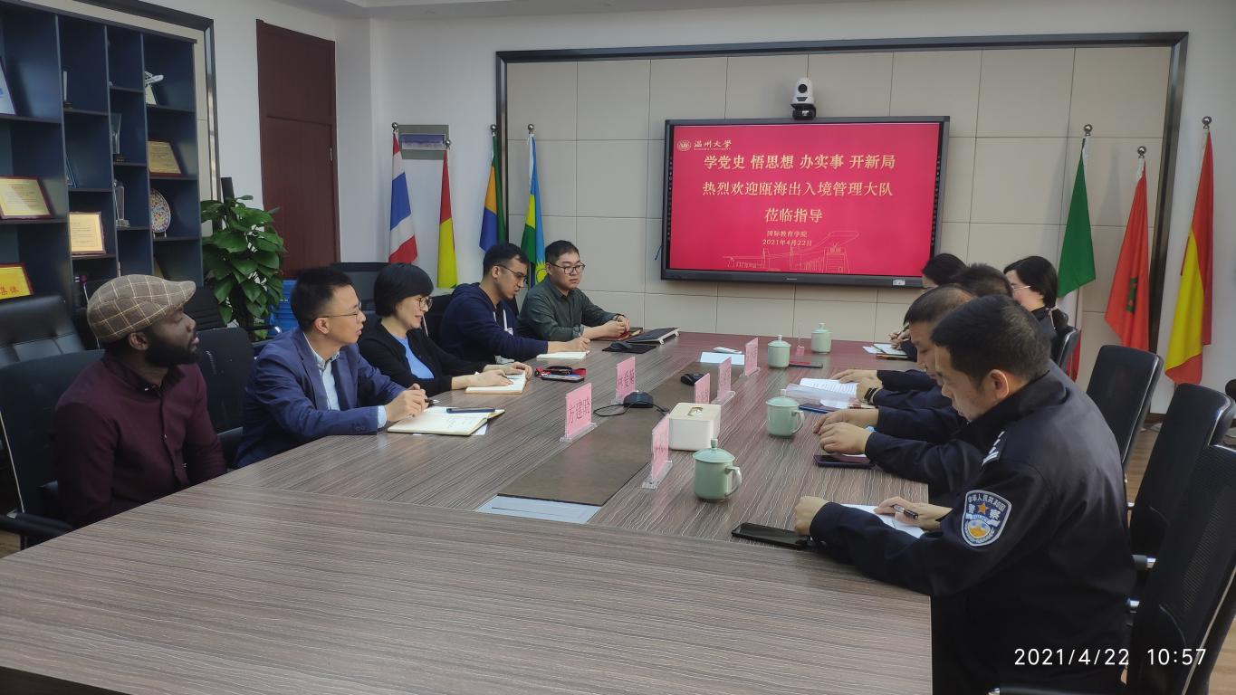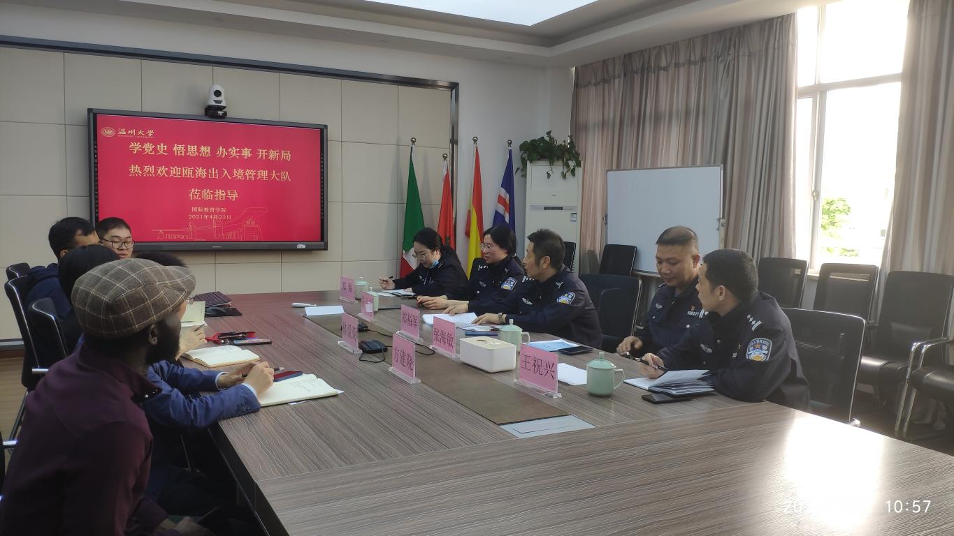4月23日上午,瓯海区公安局副局长郑裕军、瓯海区出入境管理大队大队长张海敏、王祝兴、陈小菲、郑剔警官一行来公司开展交流指导。公司党总支书记林爱菊、副书记方建晓、员工科全体辅导员参加了本次交流。