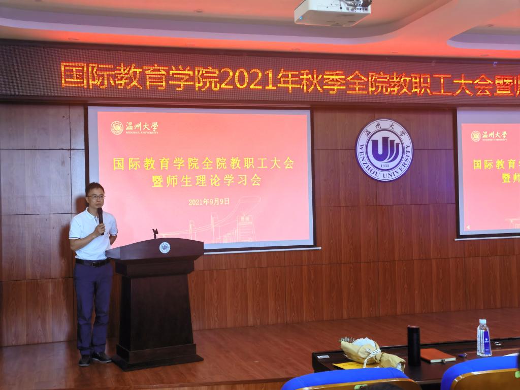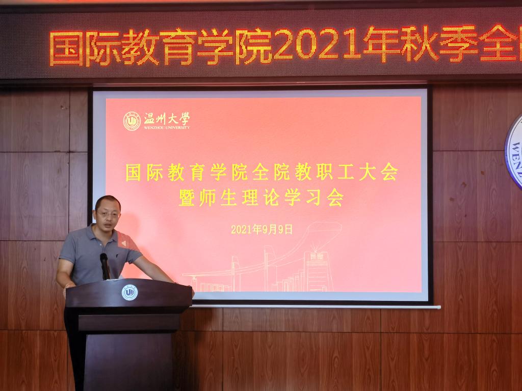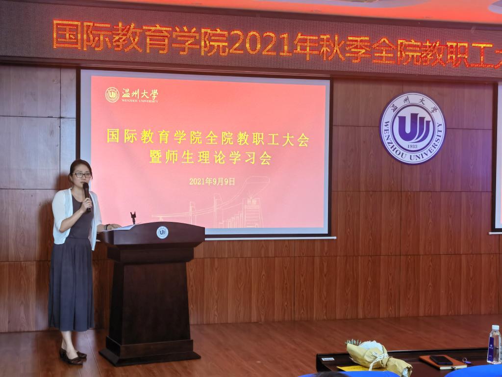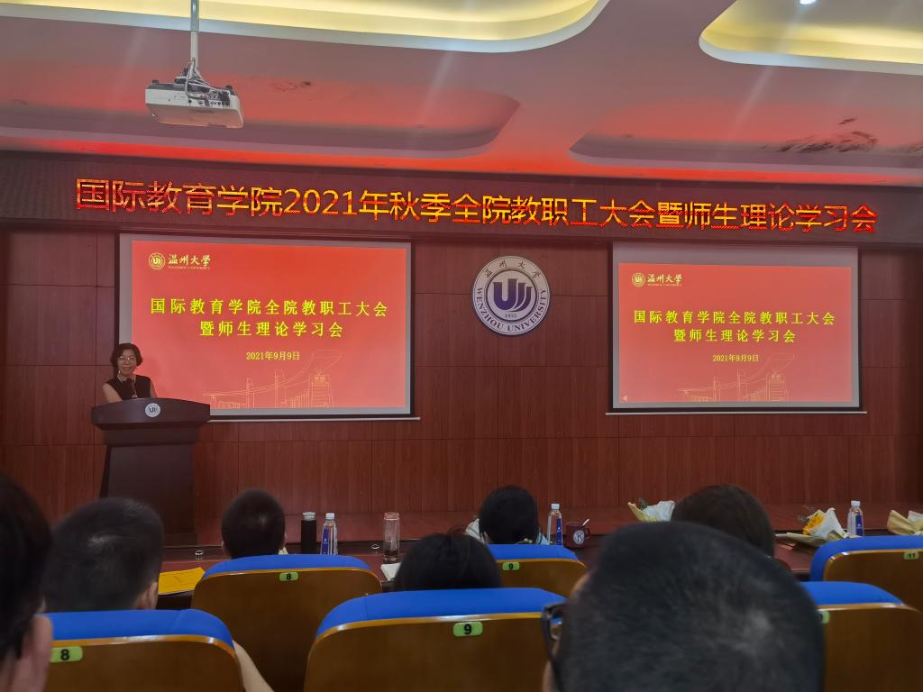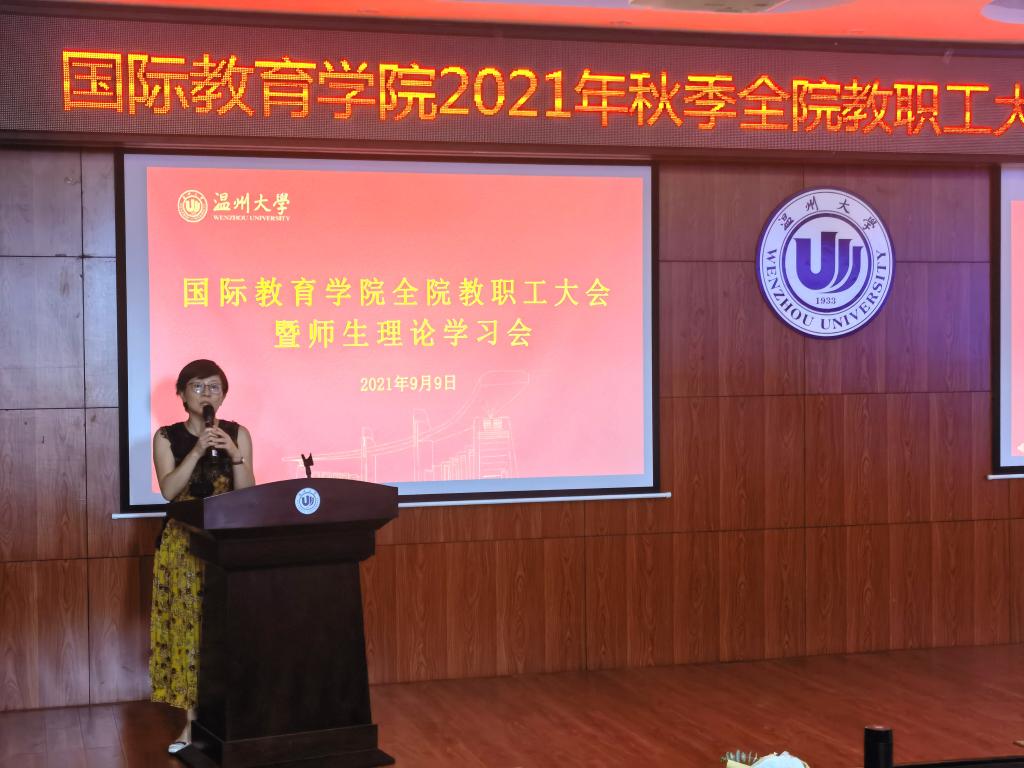 2021年9月9日下午,2021/2022第一学期新学期全体教职工大会暨教工理论学习会在国际楼203报告厅召开,会议由党总支书记林爱菊主持。