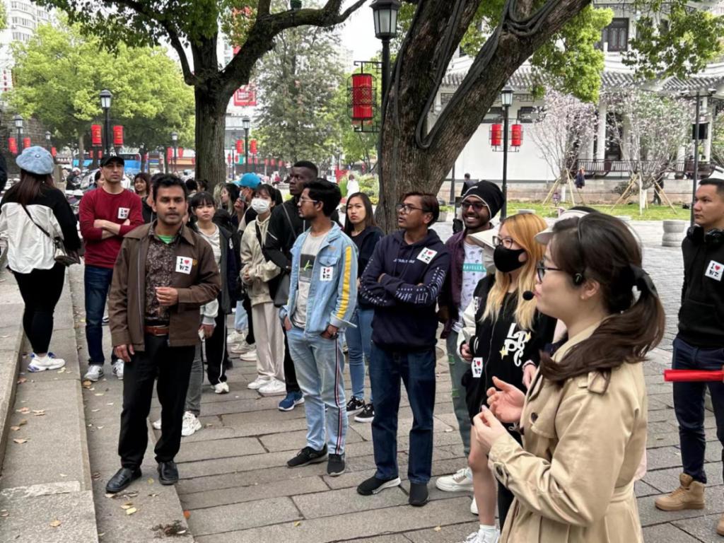 在五马历史文化街区,大家看到这里已竖立起了醒目的英语标牌,有着浓浓的国际化氛围。而“迎亚运——温州古城文化推介”使者用英语为外国朋友解说,这里的街区英语导览,也受到大家欢迎,纷纷用手机扫描二维码体验。参观中,沿袭着东瓯建筑美学的古戏台和布局精品零售业态的五马街吸引着大家频频驻足。