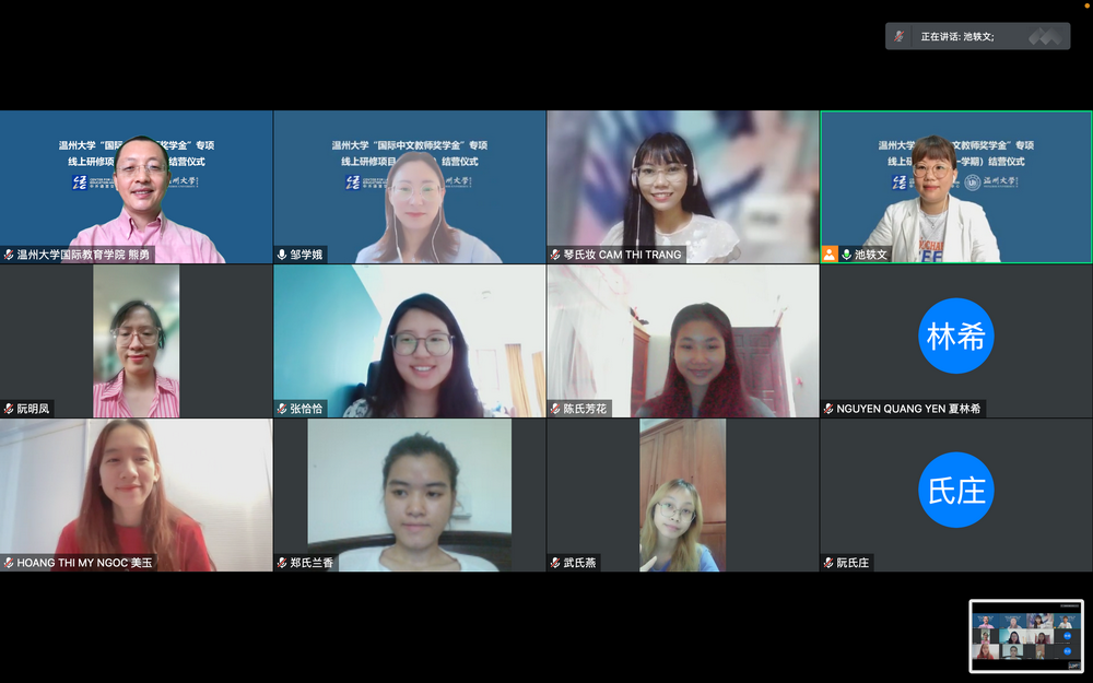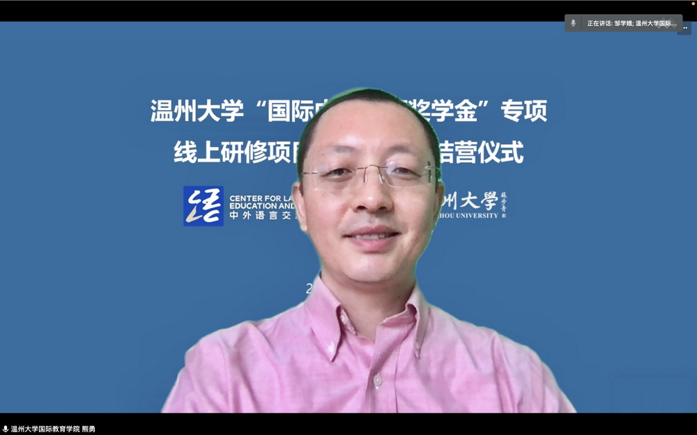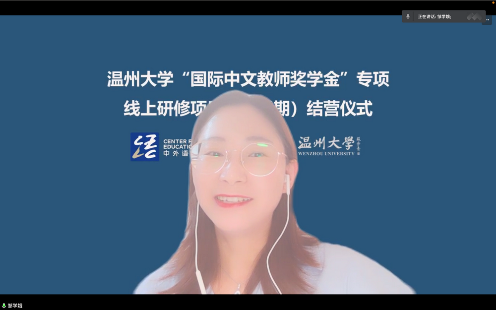 然后,由公司教师代表邹学娥老师讲话。她对全体学员表示祝贺和感谢,认为本次线上学习营的圆满成功离不开教师和员工之间的相互支持,深感教学过程中见证了员工们对学习汉语的热情和坚持,教师们也为此深受感动,并将这份感动化为教学中的热情与耐心。最后,她期待大家能来中国留学,能来古天乐代言太阳集团138看看。