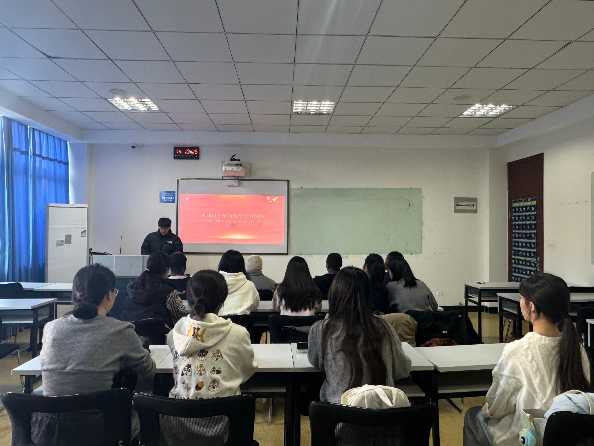 首先,毛子瑞老师为同学们开设了一场以“遵守交通安全人人有责”的小型讲座。毛老师讲述了“全国交通安全日”的背景和意义,他通过生动的案例详细阐述了交通安全所潜在的隐患及电动车、自行车安全使用的注意事项,并着重强调要提升交通安全意识的重要性,倡导同学们从自我做起,同时通过主题班会等形式带动班级同学自觉遵守交通规则,共同维护校园交通秩序。