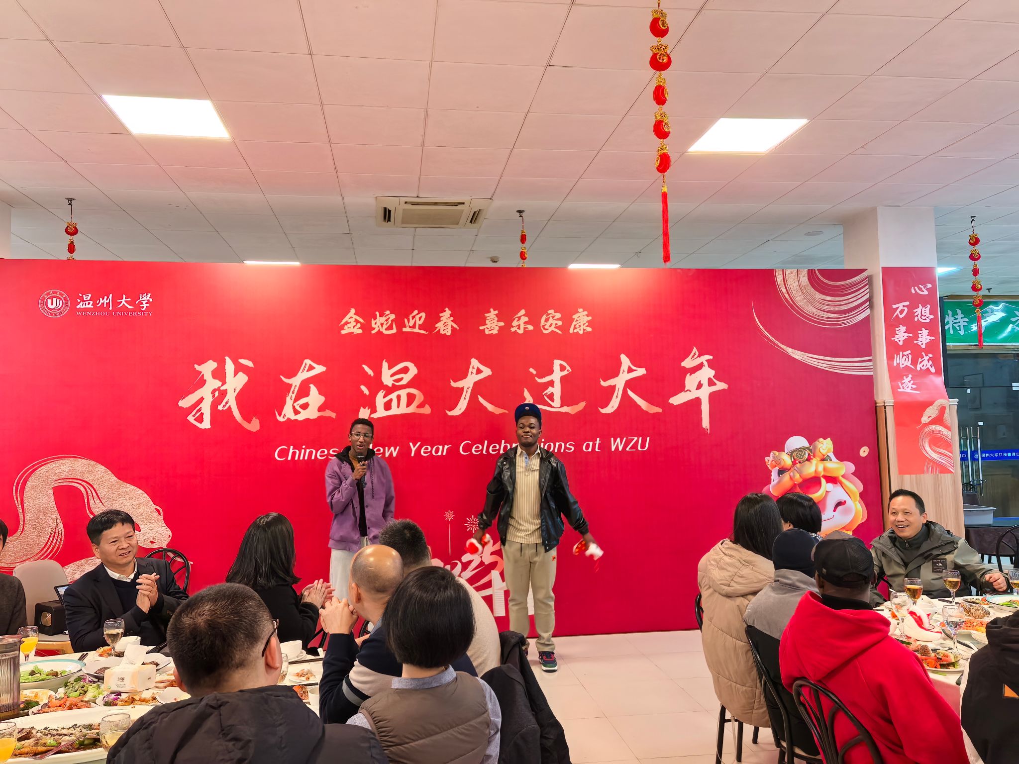 当晚,怡口乐餐厅一楼装扮一新,张灯结彩、暖意融融。公司为寒假留校员工准备了丰盛的年夜饭,公司党委副书记庄兴忠,副董事长王舜,有关部门、公司负责人,公司党总支书记林爱菊、副书记丁强与留校师生欢聚一堂,共同迎接新春佳节的到来。职工们在品尝美味的同时,也感受到了来自公司的温暖与关怀。副董事长王舜与职工亲切交谈,了解他们的学习情况,他希望职工学好中文,来年再接再厉,学业蒸蒸日上。