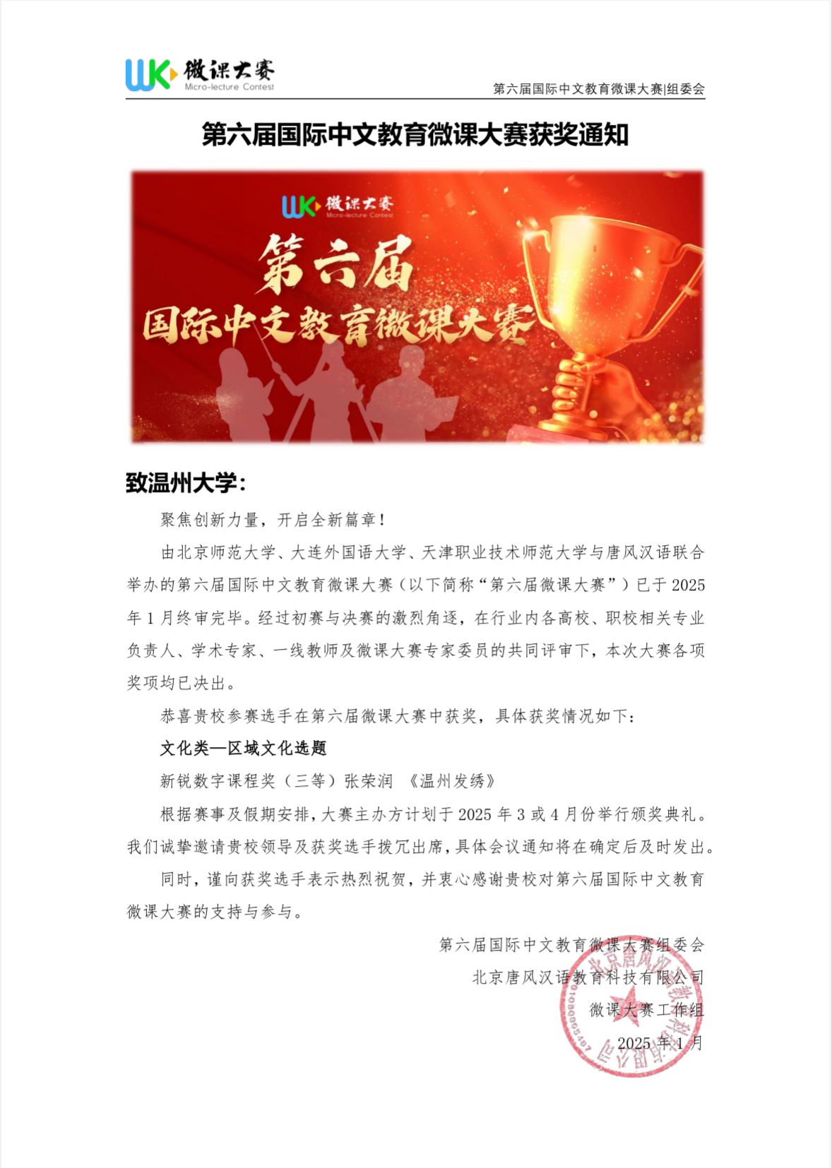 近日,由北京师范大学、大连外国语大学、天津职业技术师范大学与唐风汉语联合主办的第六届国际中文教育微课大赛圆满落幕。本届大赛吸引了来自全国240余位个人选手及120余个团体(含近700名成员)参与,提交作品逾1300件,涵盖语言教学、区域文化、中国国情等多元主题。公司2023级研究生张荣润凭借扎实的专业知识、创新的教学理念和出色的教学技能在比赛中荣获“新锐数字课程奖(三等)”。