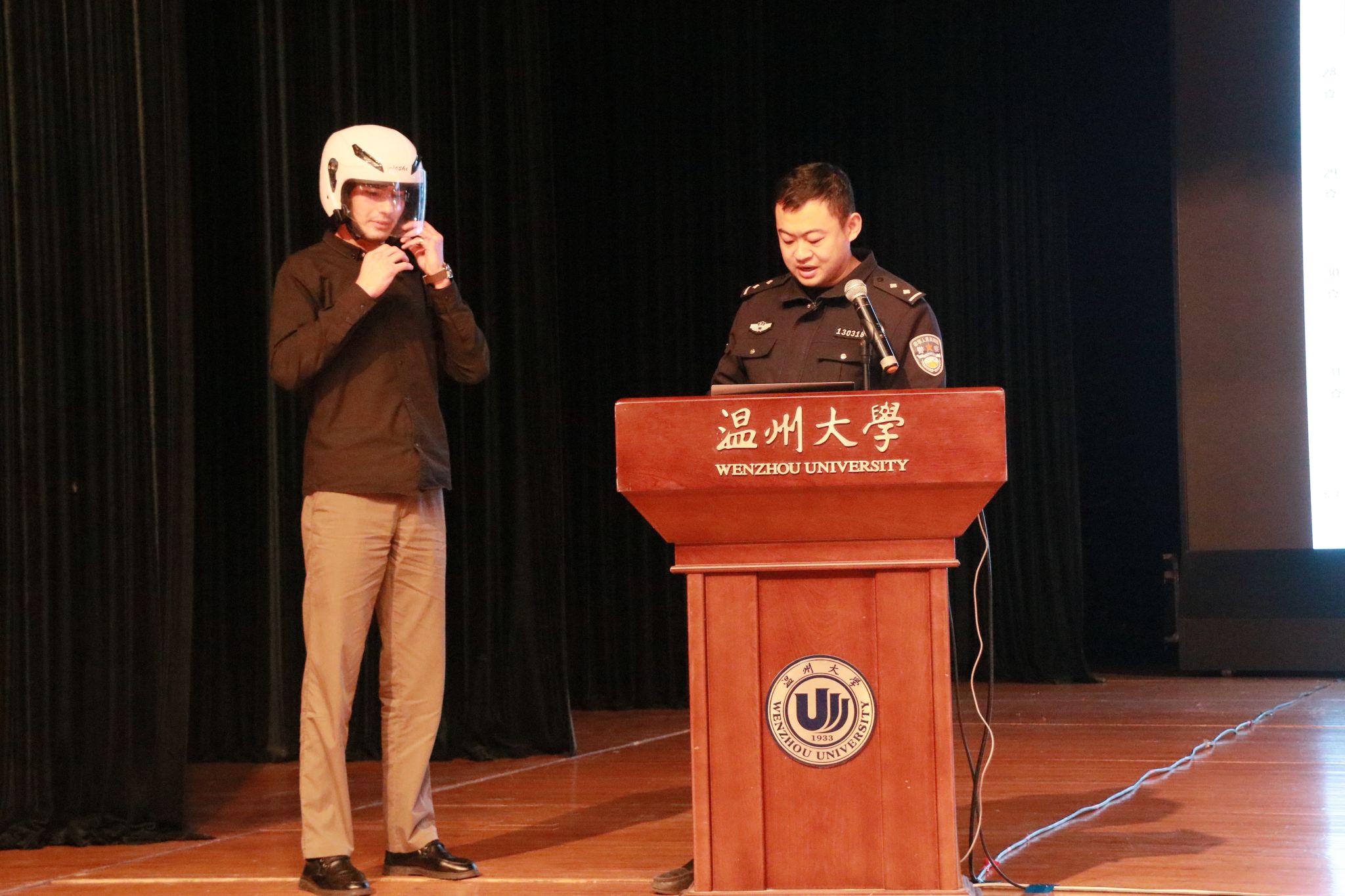 温州市交警四大队八中队副中队长邱强楠围绕交通安全展开深入讲解。邱队长通过一系列触目惊心的交通事故案例,直观展现违反交通规则带来的严重后果,以此强调遵守交通规则的重要性。此外,邱队长还为国际员工提供了实用的出行建议,提醒同学们务必遵守交通规则,过马路要走人行道,骑车要正确佩戴安全头盔等。