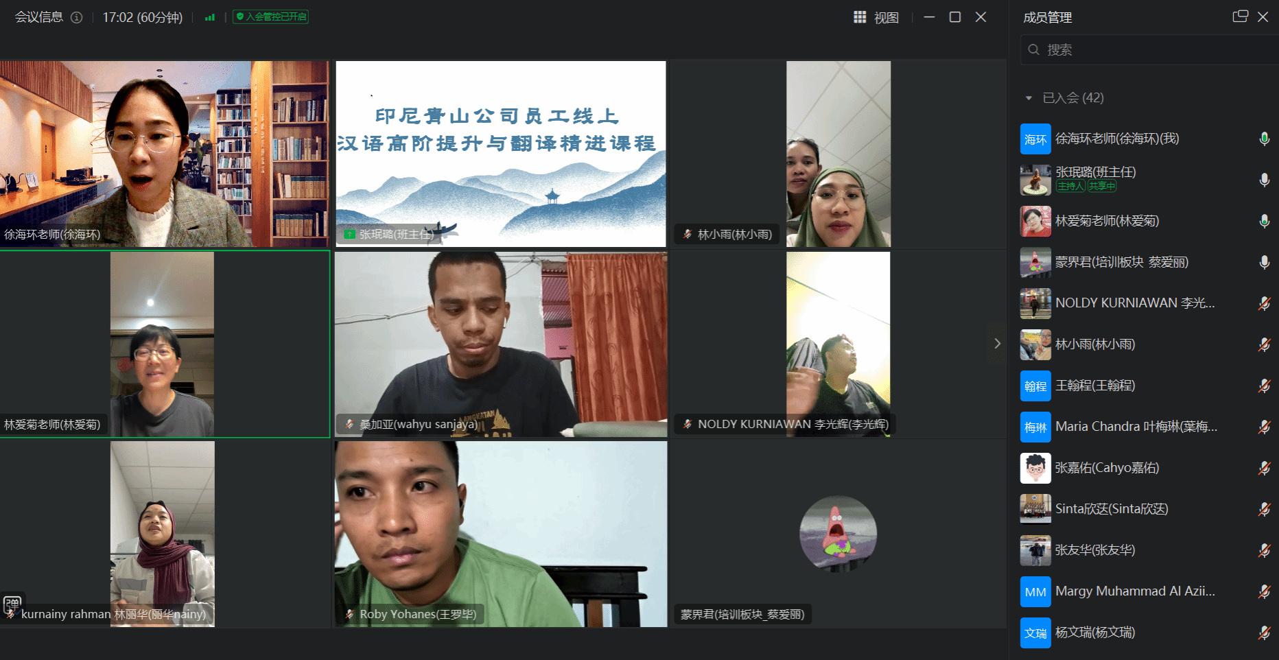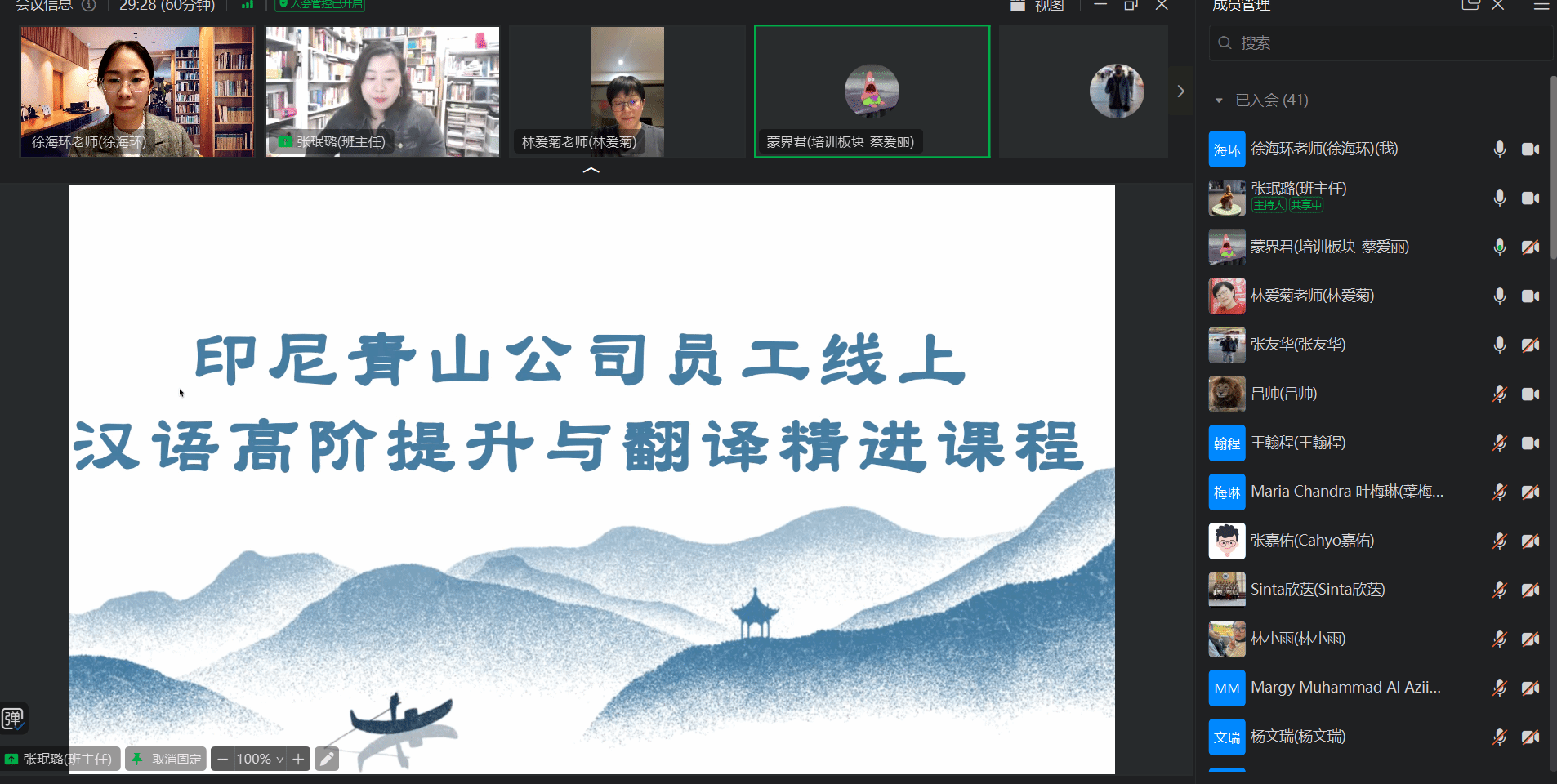 班主任张珉璐老师在开班仪式上,向学员们详细介绍了课程设置及学习要求。此次课程着重聚焦高阶汉语应用与专业翻译技能两大关键板块,深入贴合印尼青山公司的实际业务场景与员工工作需求,精心定制教学内容。在教学过程中,将借助多样化的线上互动形式,如实时答疑、小组讨论等,充分调动学员的学习积极性;同时,布置针对性强的作业,通过作业完成情况检验学员对知识的掌握程度,以此多维度确保学习效果,助力学员切实提升高阶汉语能力。