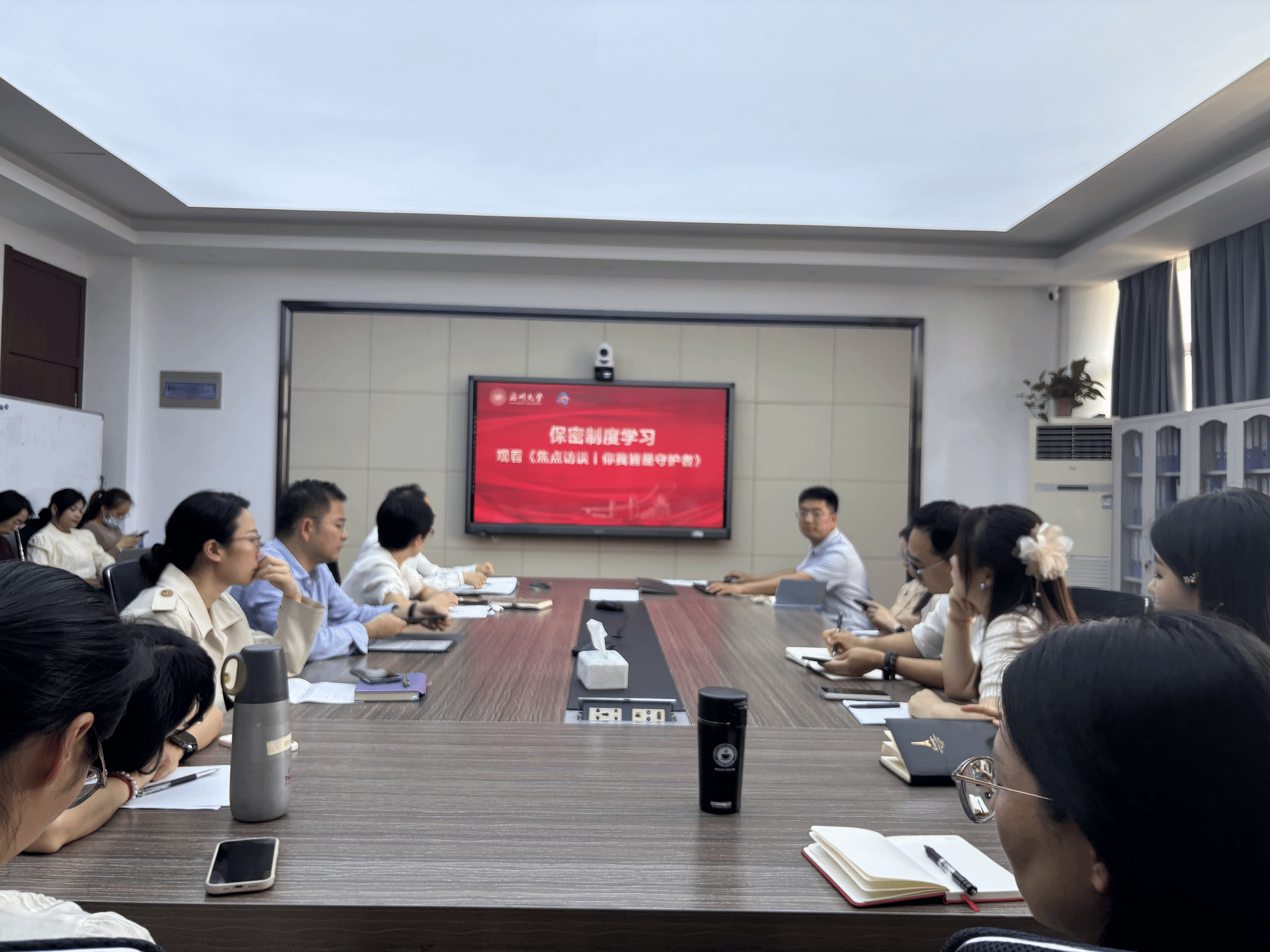 为进一步增强教职工的安全保密意识,筑牢校园保密防线,会议首先观看了安全保密宣传片《焦点访谈|你我皆是守护者!》。该片通过真实案例剖析和专家解读,生动诠释了新时代保密工作的重要性,深刻警示了日常工作中可能存在的泄密风险。教职工们认真观看,纷纷表示将自觉践行"保密无小事"理念,在教学科研和行政管理中严格落实保密要求,切实履行维护国家安全的责任与义务。