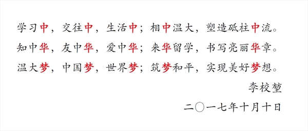 歌词起草和定稿过程中,得到公司国际化工作的积极倡议者董事长李校堃教授的悉心指导,他亲自为新歌发布题序,激励职工努力学习,实现理想。职工有了属于自己的歌曲,学歌曲也是学中文,和中国员工一起演唱还能交朋友,既丰富了精神文化活动,又提高了词汇与语感水平,对于职工提高跨文化交际水平与跨文化适应能力不无裨益。“唯以心相交,方能成其久远。”当越来越多的外国职工把中国当成自己的第二故乡来爱护,把“一带一路”当作自家的路来支持维护,当越来越多的外国民众把身边的中国人当好朋友好伙伴,“一带一路”也必然将行稳致远,我们的“中国梦”也终能梦想成真。