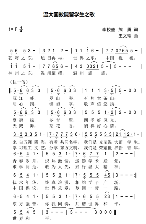 歌曲采取带有人声引子的主副歌两段式结构,引子较为舒展,主歌活泼,副歌节奏拉宽与主歌形成对比。整歌曲风清新明快,曲调琅琅上口。歌词内容既响应了当下倡导“一带一路”、呼吁“世界和平”的时代特征,也包含了“求学问是,敢为人先”的“温大精神”;既展现了中华民族不断提振的文化自信,又彰显了贡献中国智慧“分享东方文明”的大国担当。歌中先后如数家珍般提及温大校园耳熟能详、温大人引以为豪的区位元素与景观特征,如“瓯江”、“罗山”、“茶山”、“明心湖”、“溯初亭”、“碧绿”、“青翠”、“好风光”、“学子广场”等;其中“天鹅舞”、“茶花香”更是使平面的影像更加厚实与立体,固定的空间有了流动的芬芳,进一步表达了菁菁校园里动物与植物相得益彰,人与自然和谐相处的美好生态。听之为歌,阅之如画,忖之若诗。一幅幅美丽的自然画卷不禁映入眼帘,一幕幕融洽的人文景致跃然于心,令人意犹未尽、浮想联翩。