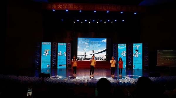 晚会在开场舞《Bang Bang》中拉开序幕。职工的汉服秀及中华礼仪表演展示了中华民族传统服饰之美和传统礼仪文化之韵;歌曲《温大国合的日子》让大家重温了在国合大家庭四年学习和生活的点点滴滴;诗歌朗诵《遇见你好幸运》和情景剧《朝花夕拾》表达了学弟学妹对即将离开的学长和学姐的不舍与牵挂;而职工王汉和他的搭档咪咪的《All about that bass》歌曲演绎则把晚会气氛推到了高潮。晚会最后,当主持人推上特别为2016届学子准备的庆祝蛋糕时,毕业班班主任带领全体毕业生合唱《不说再见》,同学们热泪盈眶,离别的情愫,不舍的眷恋,深深感染着现场每一个人。